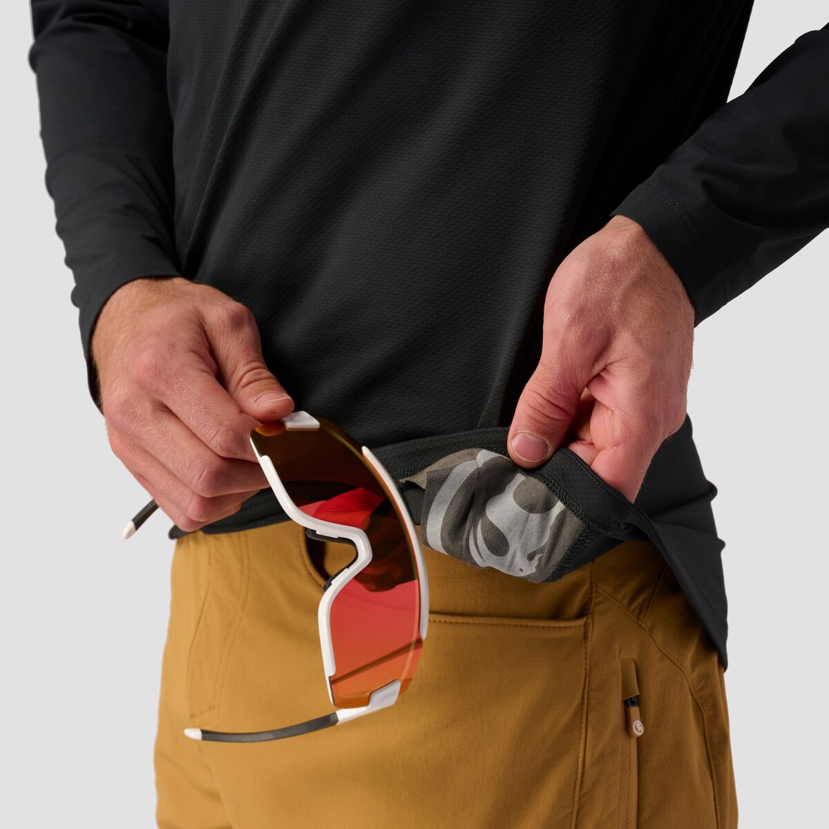 - Long sleeves provide protection from sun, brush, and debris