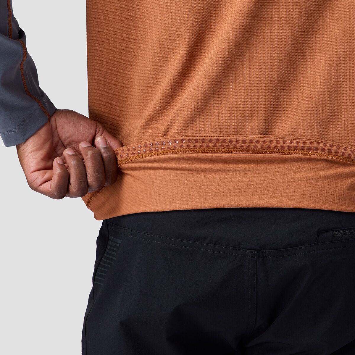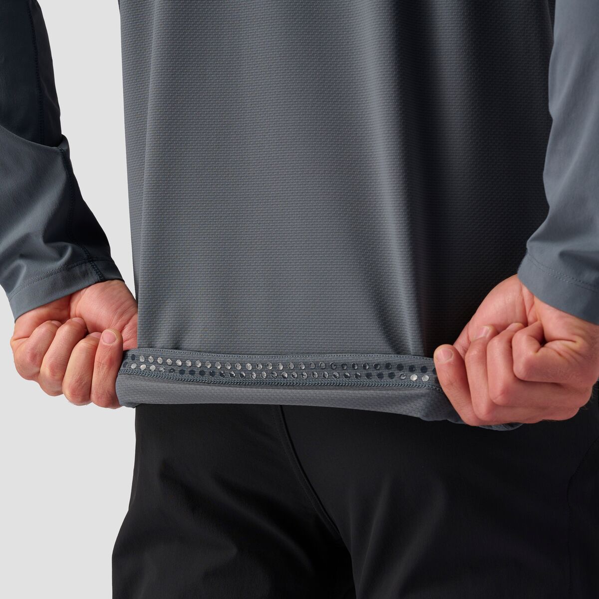 - Breathable, moisture-wicking fabric keeps us cool and dry on the trail