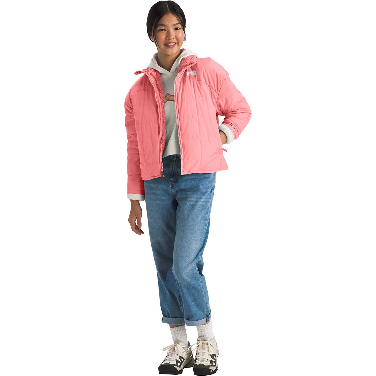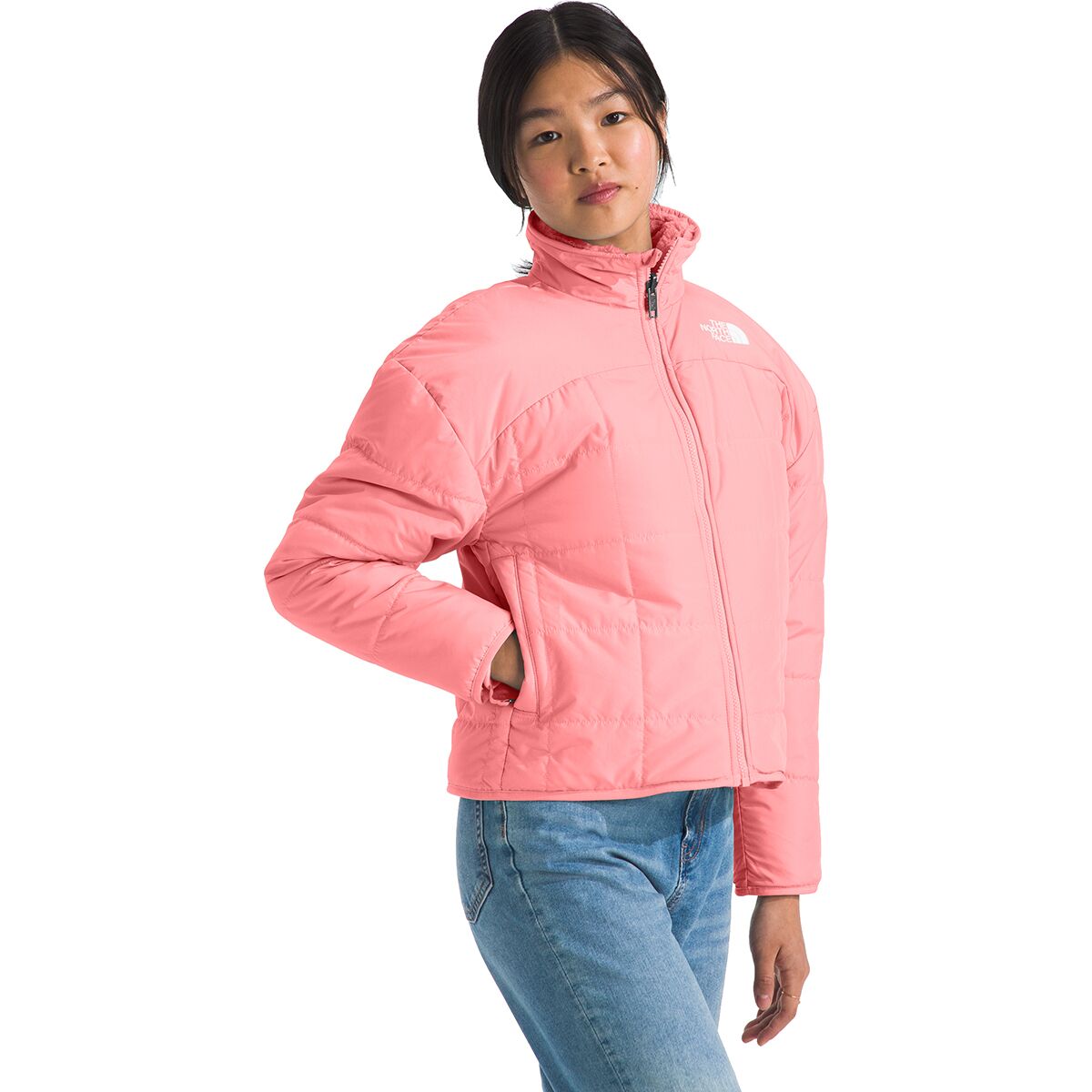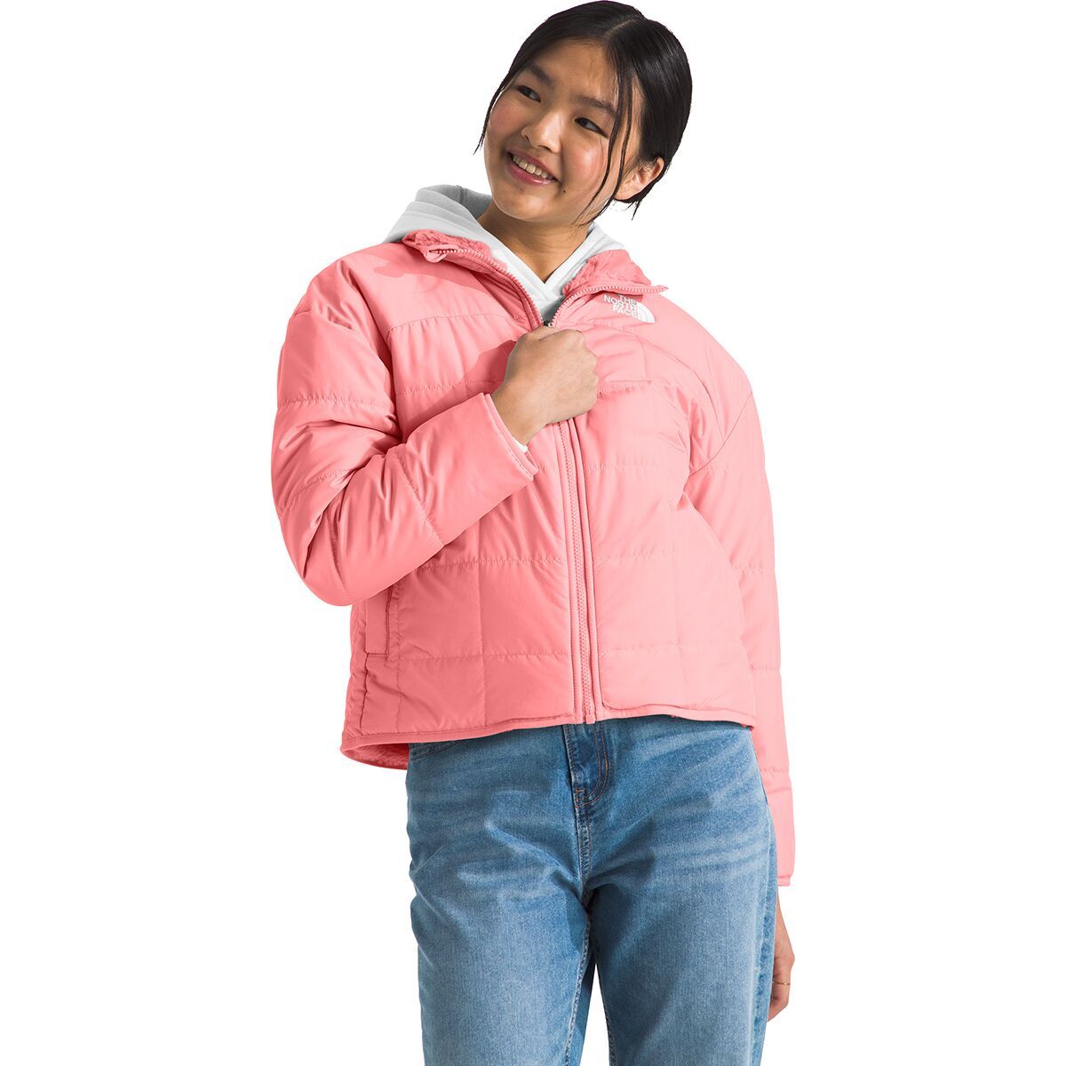 • Two-sided junior jacket offers versatile styling and cozy winter warmth
