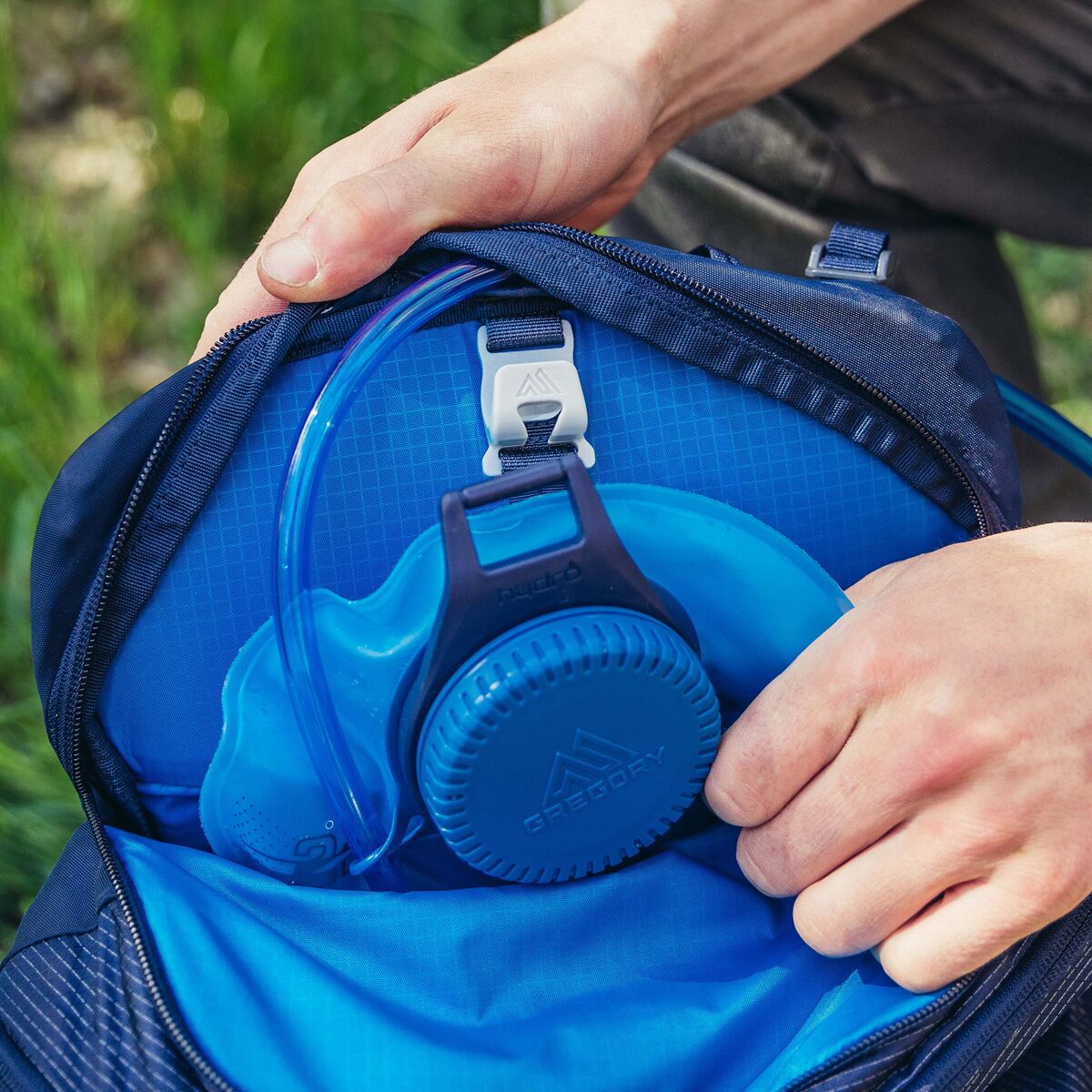 - Dedicated hydration compartment clips reservoir in place