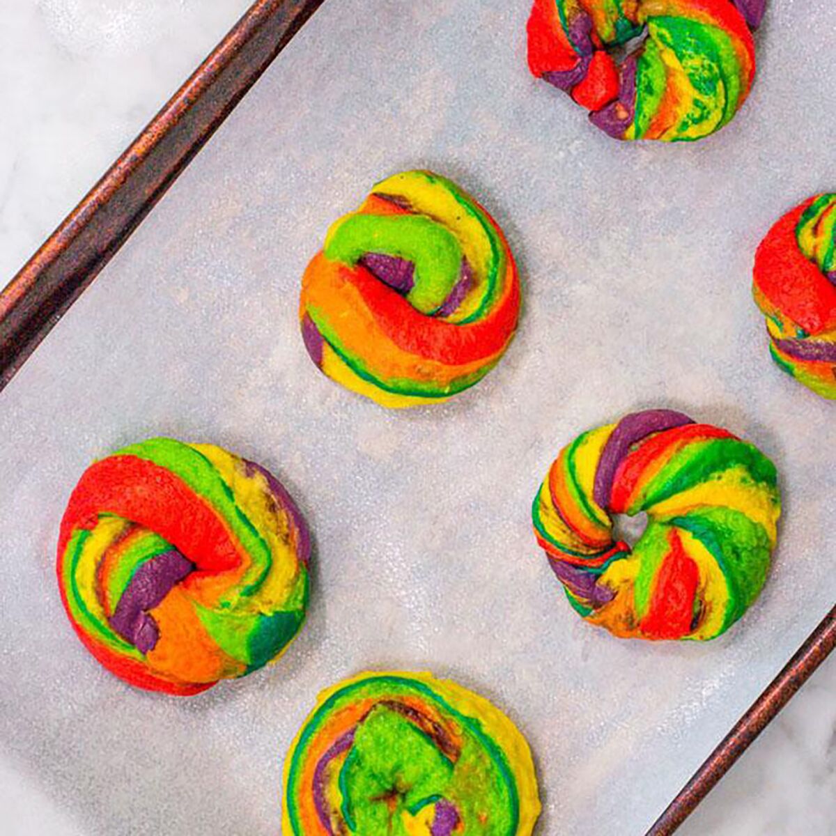 Create vibrantly-swirled rainbow bagels in your own kitchen. Delightfully playful with a perfectly crisp bagel crust, cut them open to reveal an amazing burst of color for homemade bagels that are almost too beautiful to eat.
