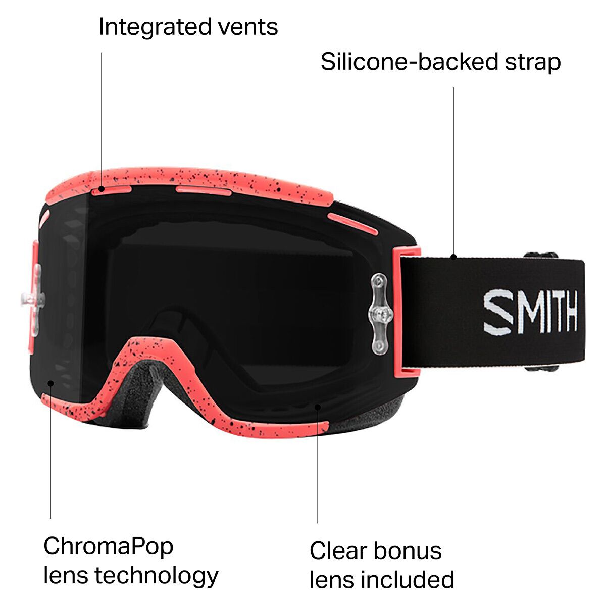 The Smith Squad MTB ChromaPop Goggle provides brilliant clarity and vibrant color rendition when you´re ripping downhill over massive boulders, clearing bigger gaps in the bike park, and pushing your limits in the local enduro series. It´s equipped with Smith´s ChromaPop lens, which enhances color rendition and improves visual acuity—both of which are vital to seeing nuances in the trail and changes in terrain when you´re moving at high speeds. Smith includes a spare clear lens for riding in low-light conditions. Both the ChromaPop and clear lens come with an anti-fog treatment, which prevents excessive sweat and condensation from obscuring your vision.
