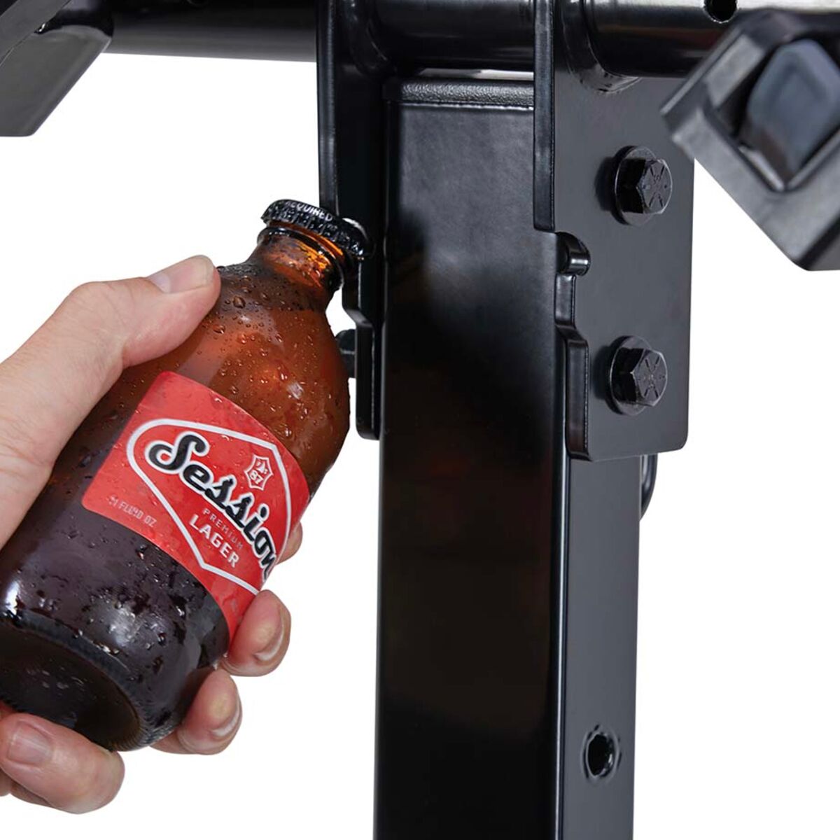 - Integrated steel loop for bike locks, and built-in bottle opener