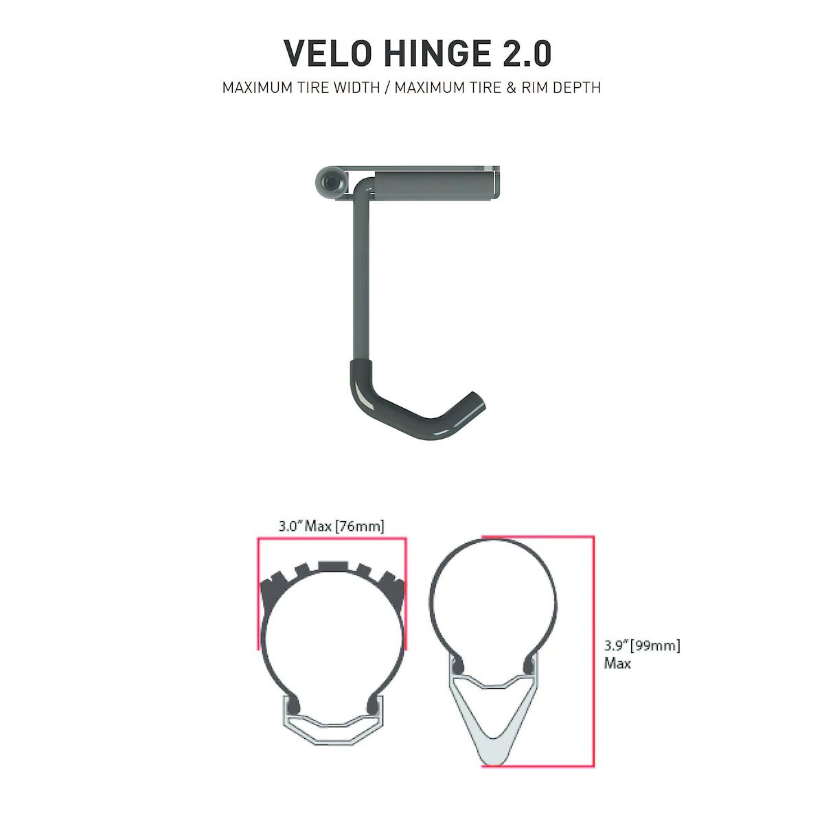 NEW! Updated with a stiffer, stronger body and a longer wheel hook, the Velo Hinge 2.0 is made for modern bikes of all types. Updated to easily fit bigger, wider wheels and tires, the familiar function of our patented Velo Hinge design allows bikes to pivot for easy access to neighboring bikes plus permits flat, space-saving bike storage along a wall. New grip tape on the tire contact plate adds stability. When not in use, the hook folds into the hinge for a clean aesthetic.