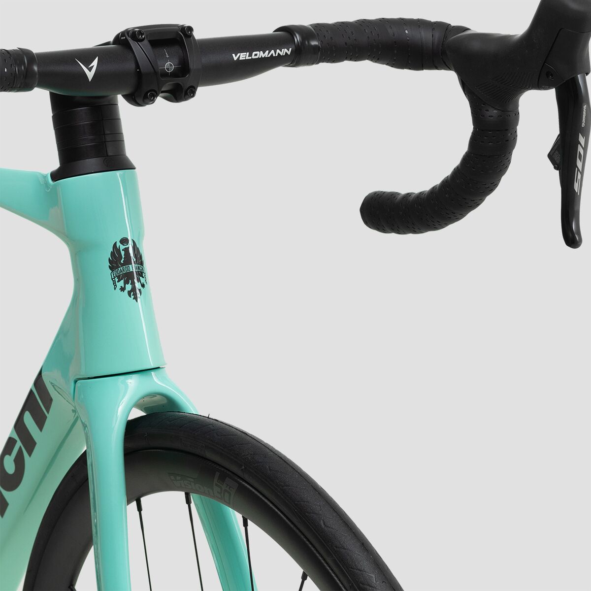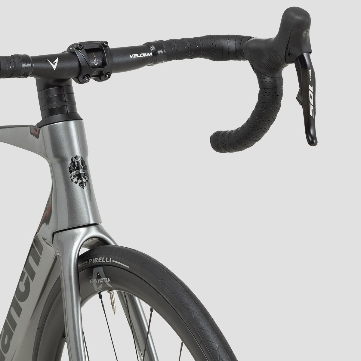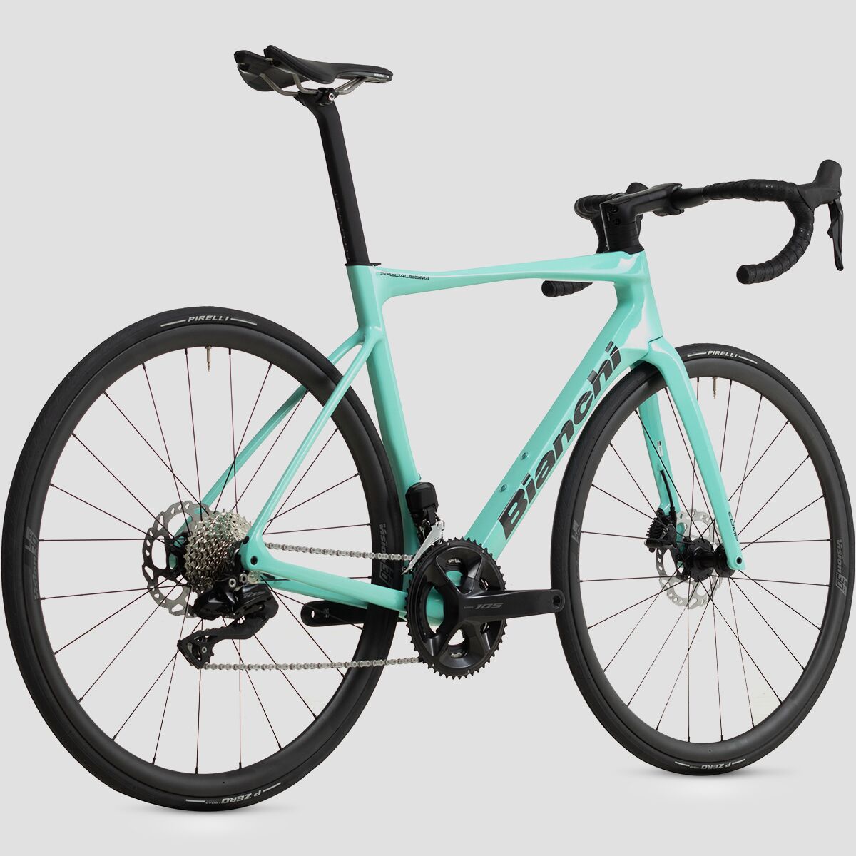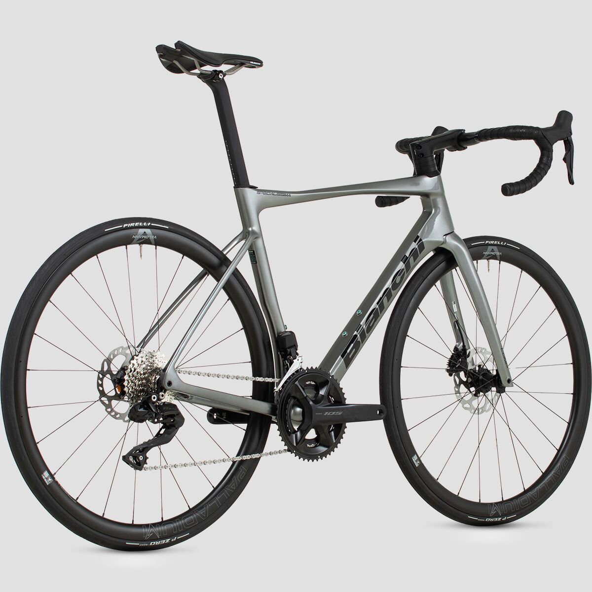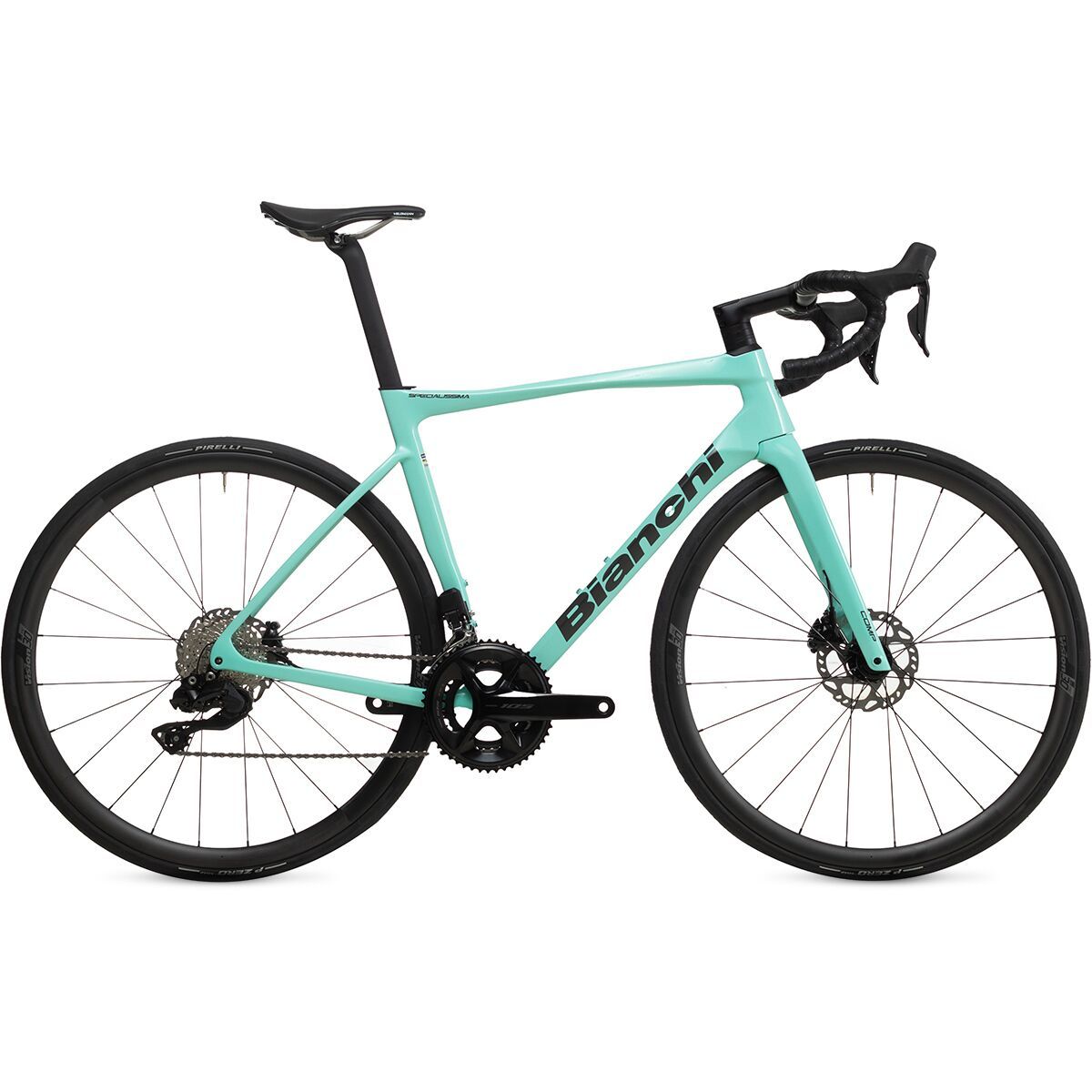 This model of the Specialissima Comp comes spec´d with the Shimano 105 Di2 drivetrain, providing us with the crisp, efficient shifting we seek in a racing machine. The high-performance platform features an ergonomic design that is easy on the hands, a racer-ready disc brake system that makes stopping feel fun, and a 12-speed range that offers plenty of gearing for any terrain we encounter. Bianchi added the Velomann Palladium wheels with Pirelli P ZERO Race tires for optimized speed, handling, and lightweight efficiency.
