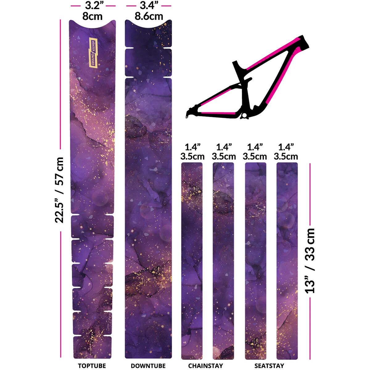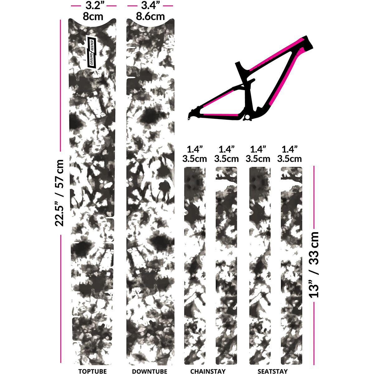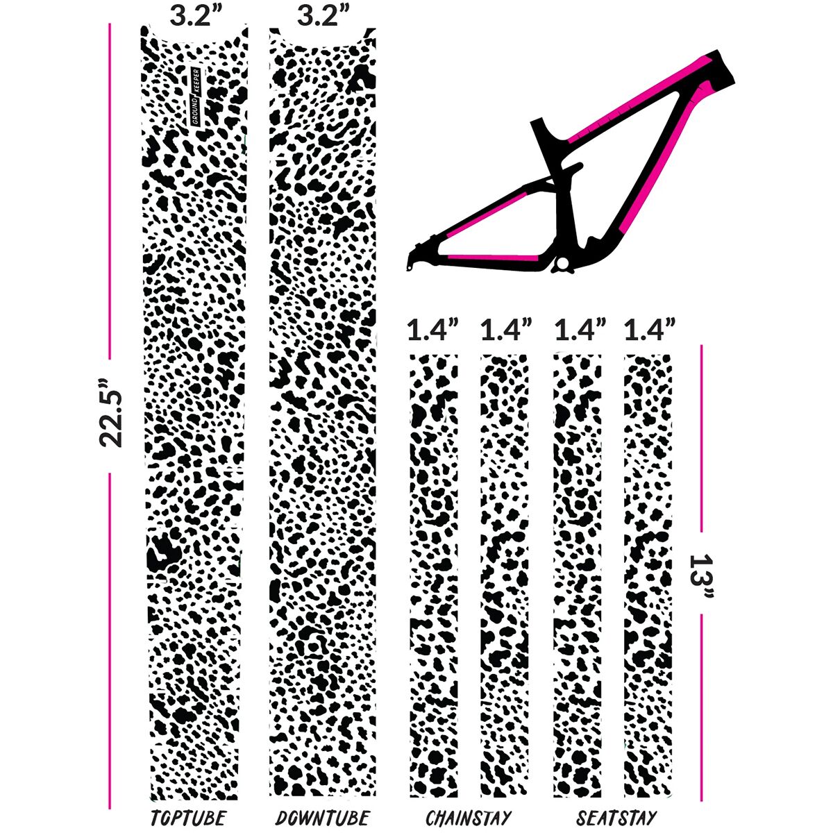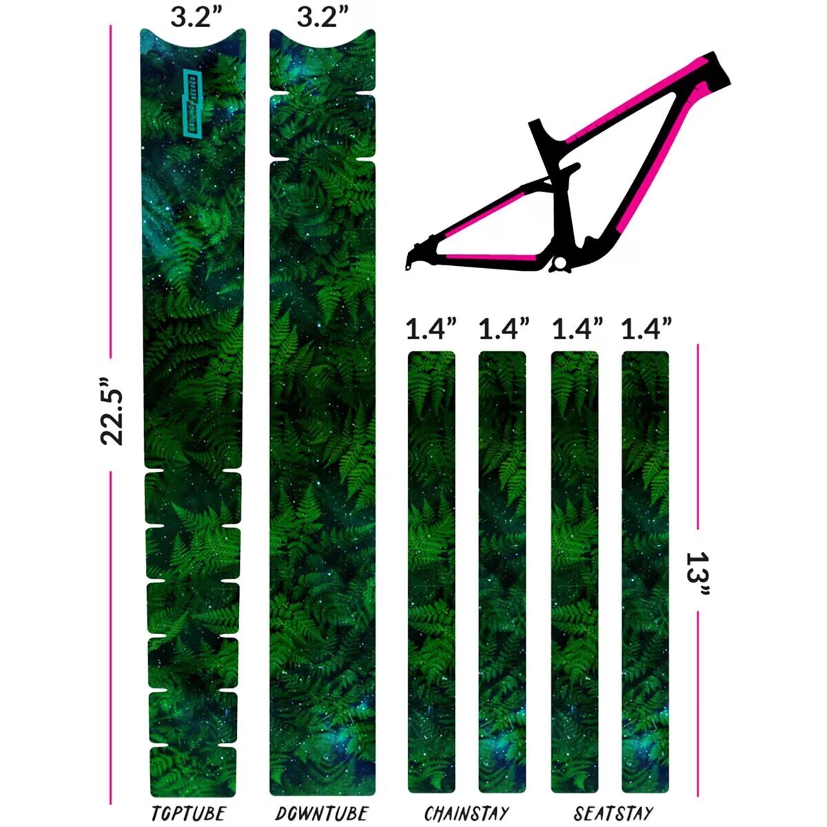 - 6 pieces to cover top tube, downtube, chainstays, and seatstays