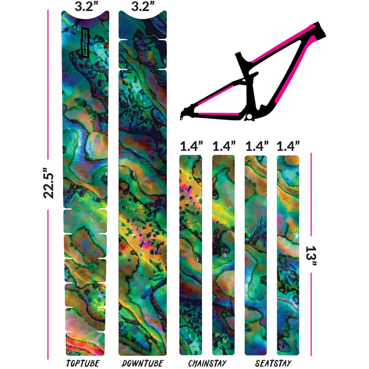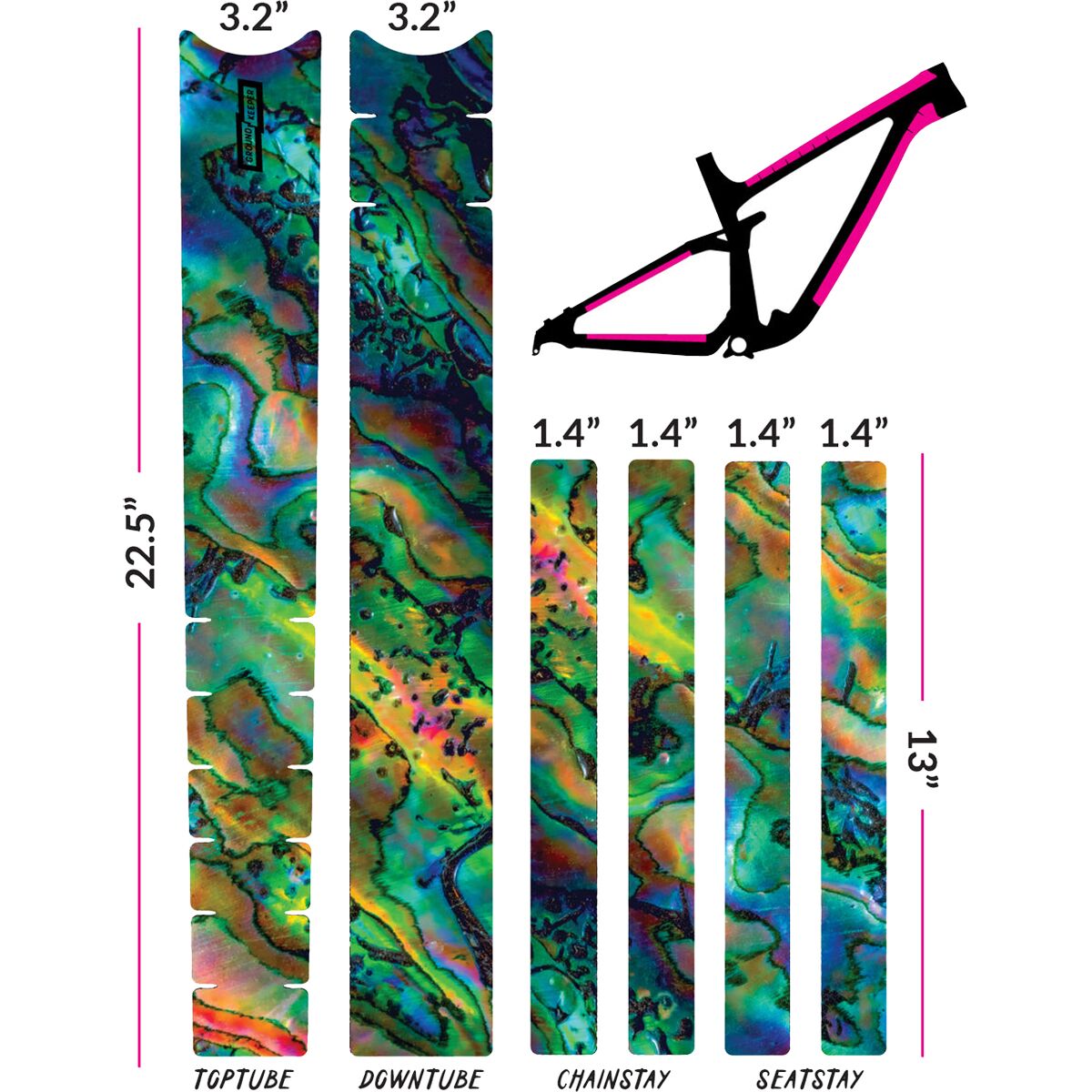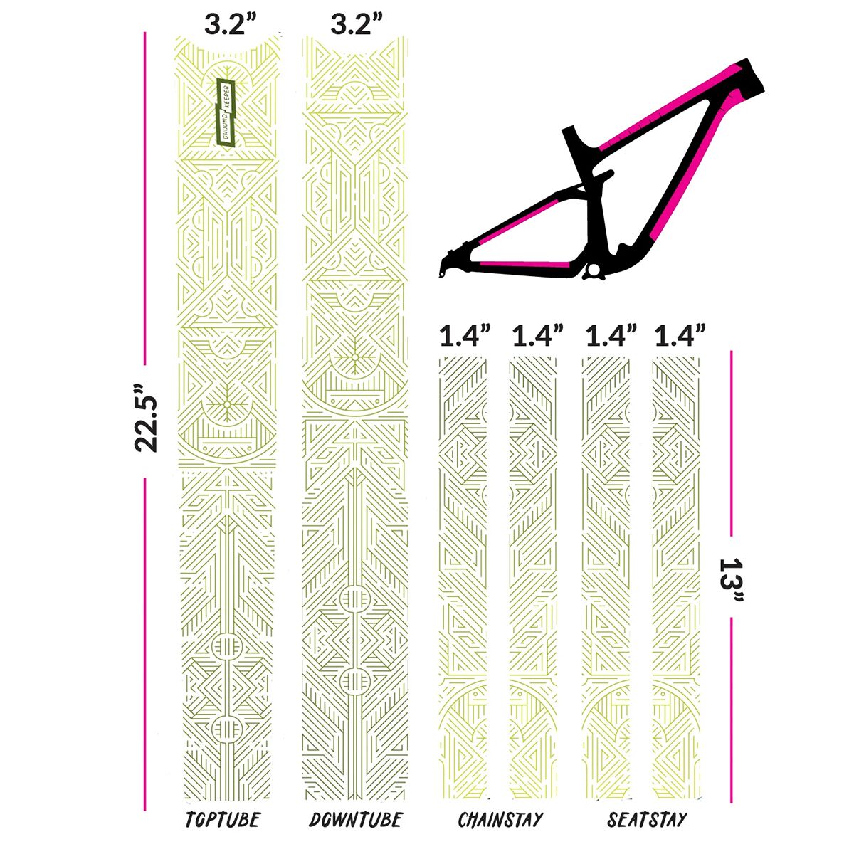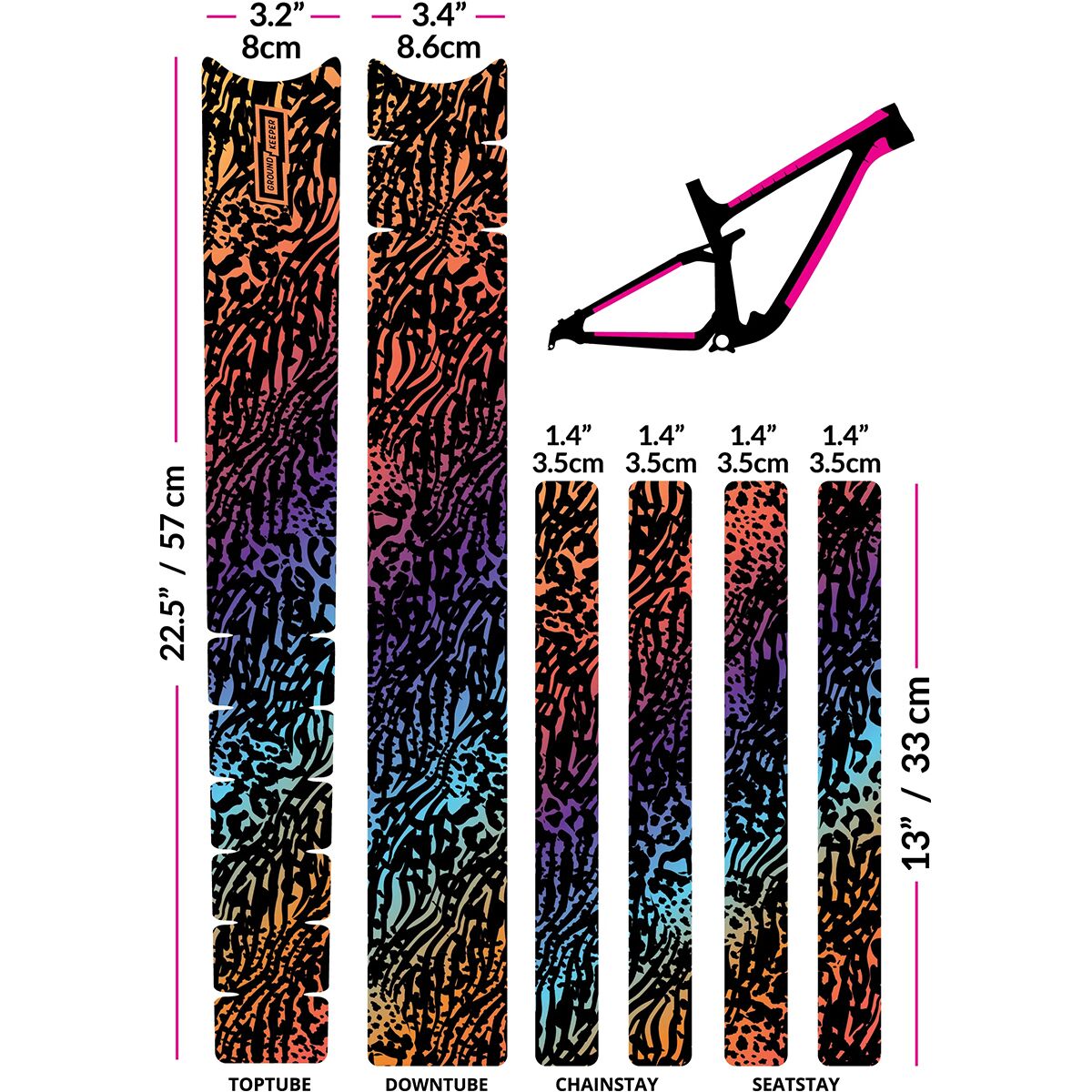- 6 pieces to cover top tube, downtube, chainstays, and seatstays