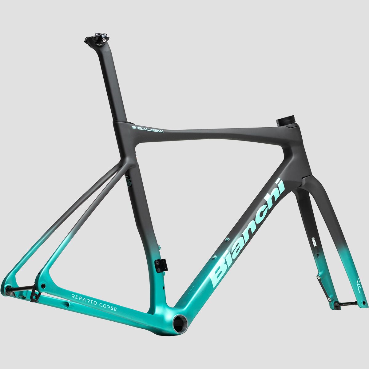 With the Bianchi Specialissima RC Disc Road Bike Frameset, our dream all-around race bike is finally before our eyes. The Specialissima RC carbo HM frame is incredibly lightweight to help us float up any climb, but it also boasts an excellent stiffness-to-weight ratio to ensure our power transfers directly to the pedals. The race-specific geometry places us into an aerodynamic, yet comfortable, position that allows us to produce every possible watt while minimizing fatigue. Compatible with only electronic groupsets, this frameset is perfect for incorporating our favorite high-speed electronic shifting. It also features fully internal cable routing, keeping our cockpit looking clean and optimizing aerodynamics as we sprint to the top of the podium.