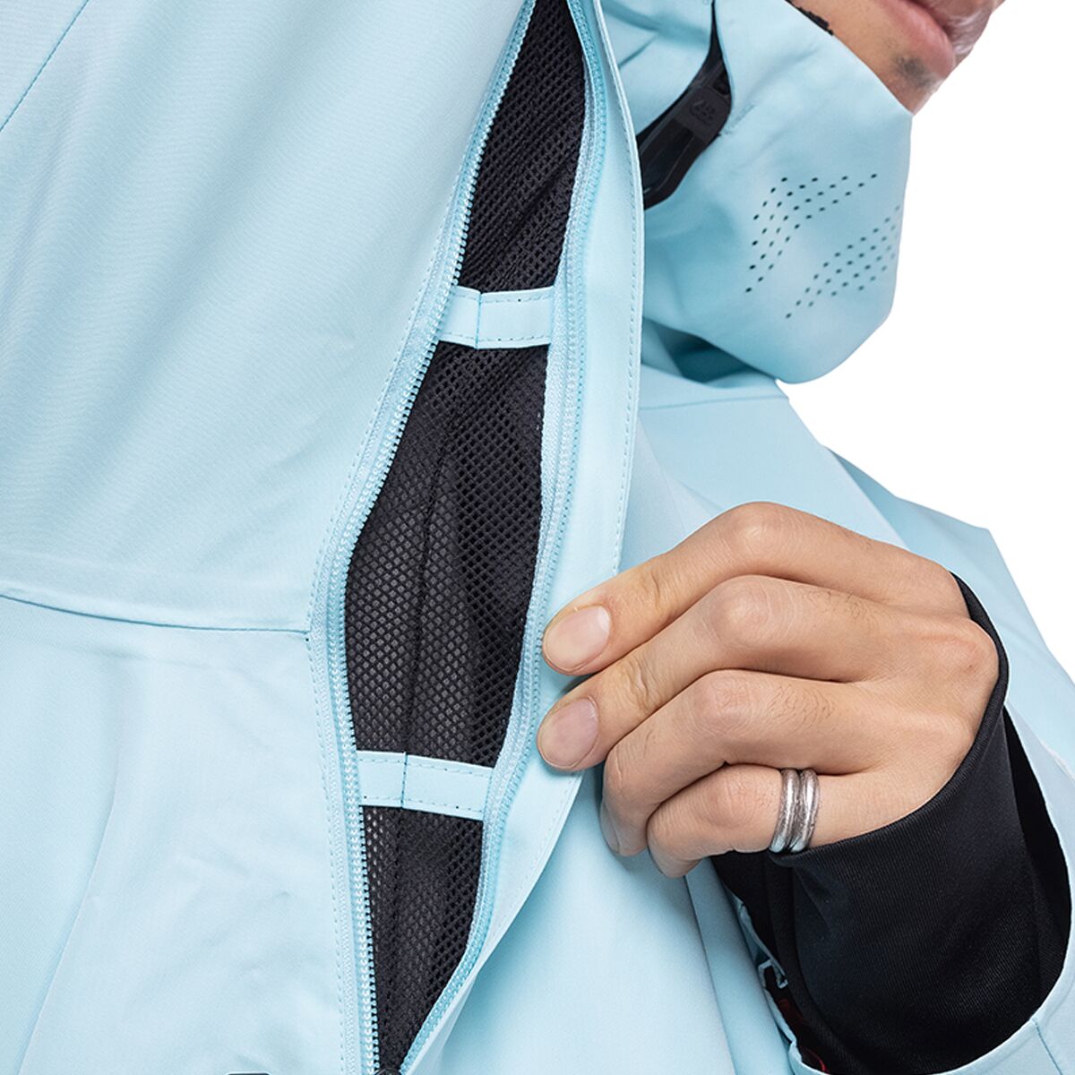 • Adjustable powder skirt keeps snow on the outside