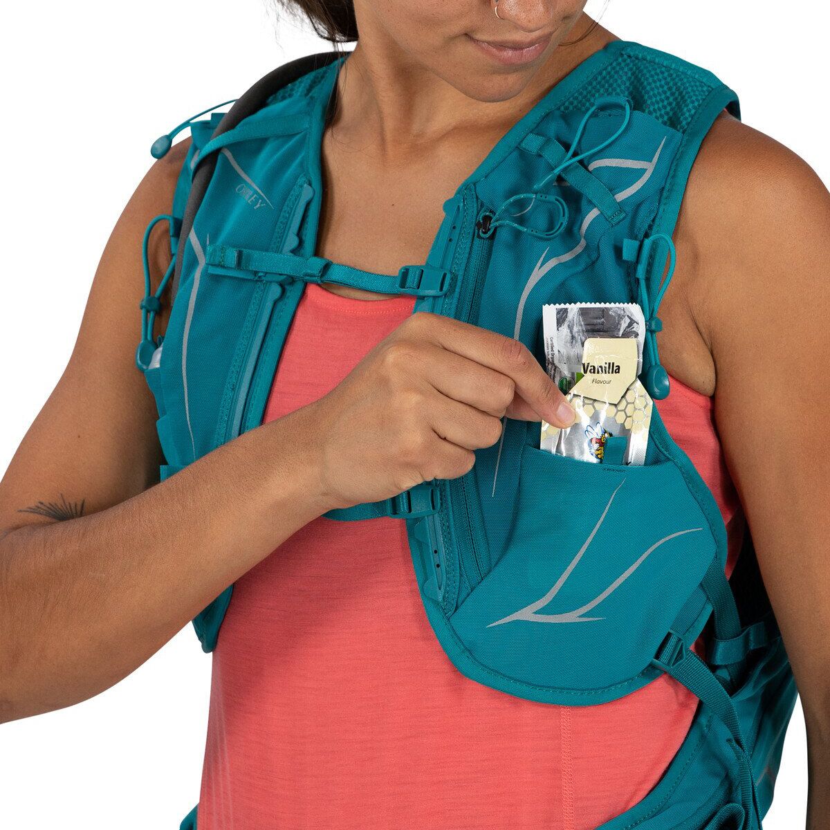 • Front harness pockets keep snacks and gels at hand