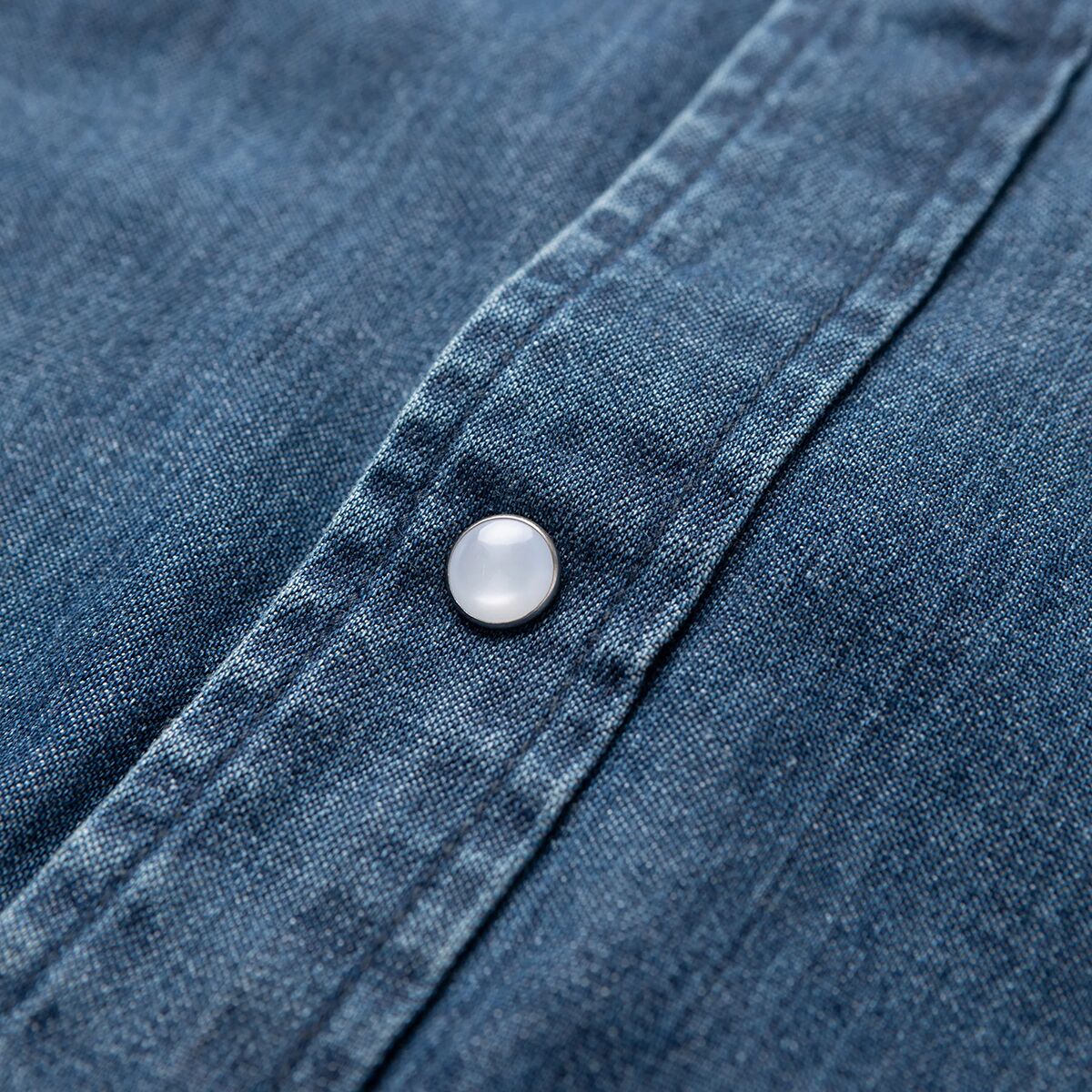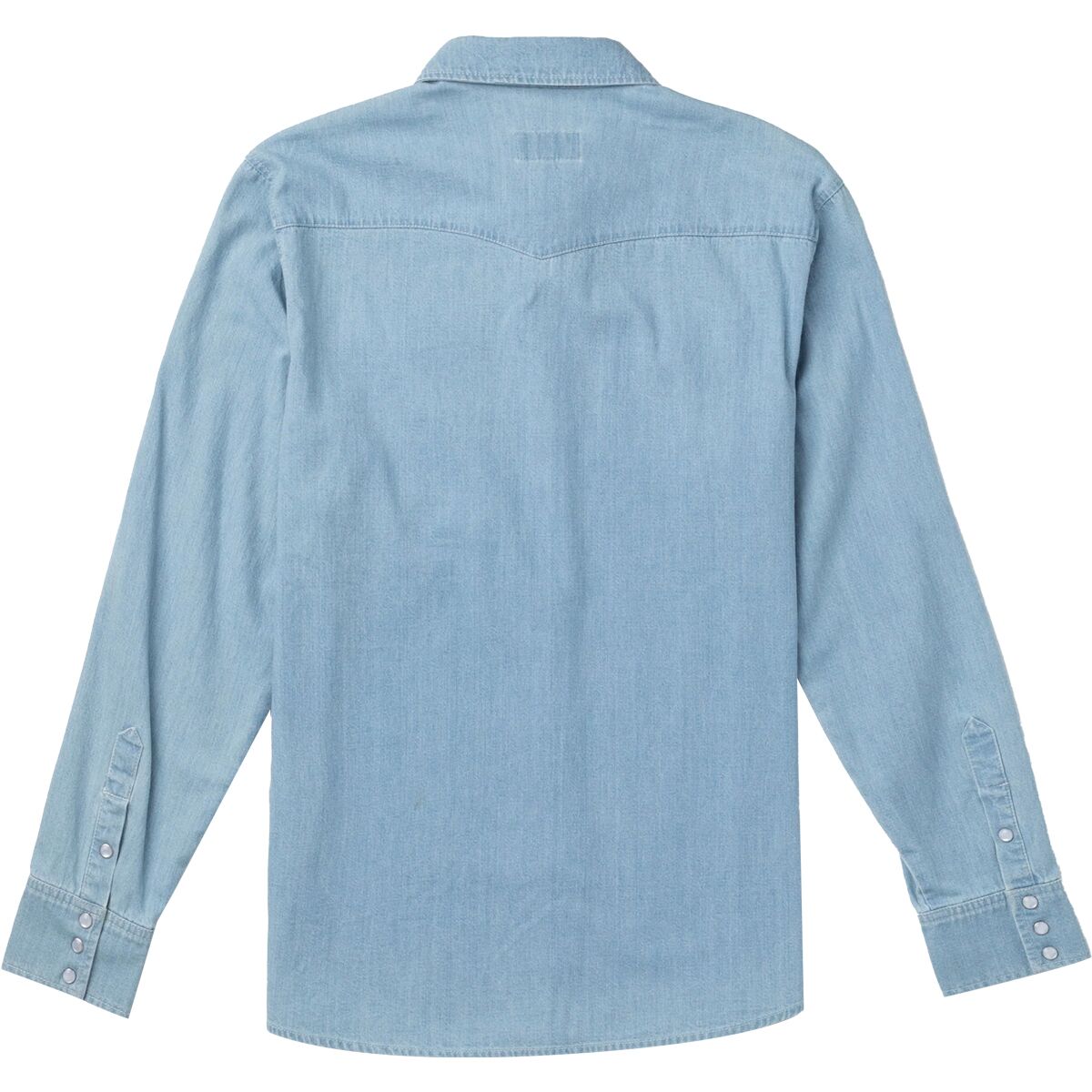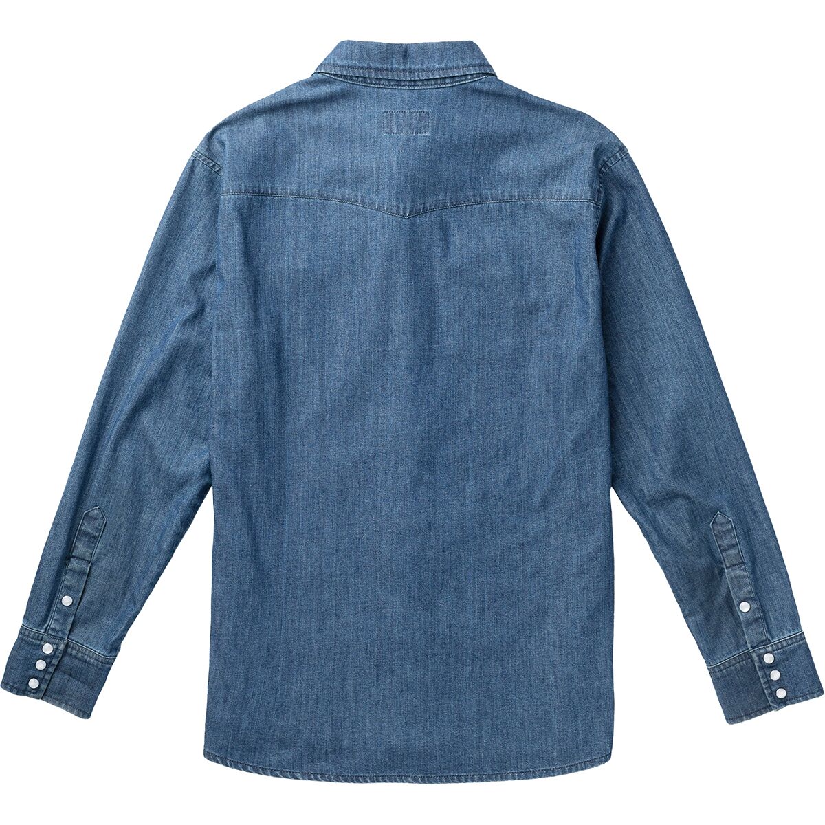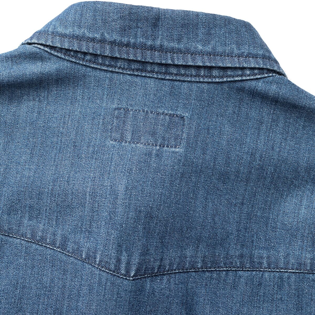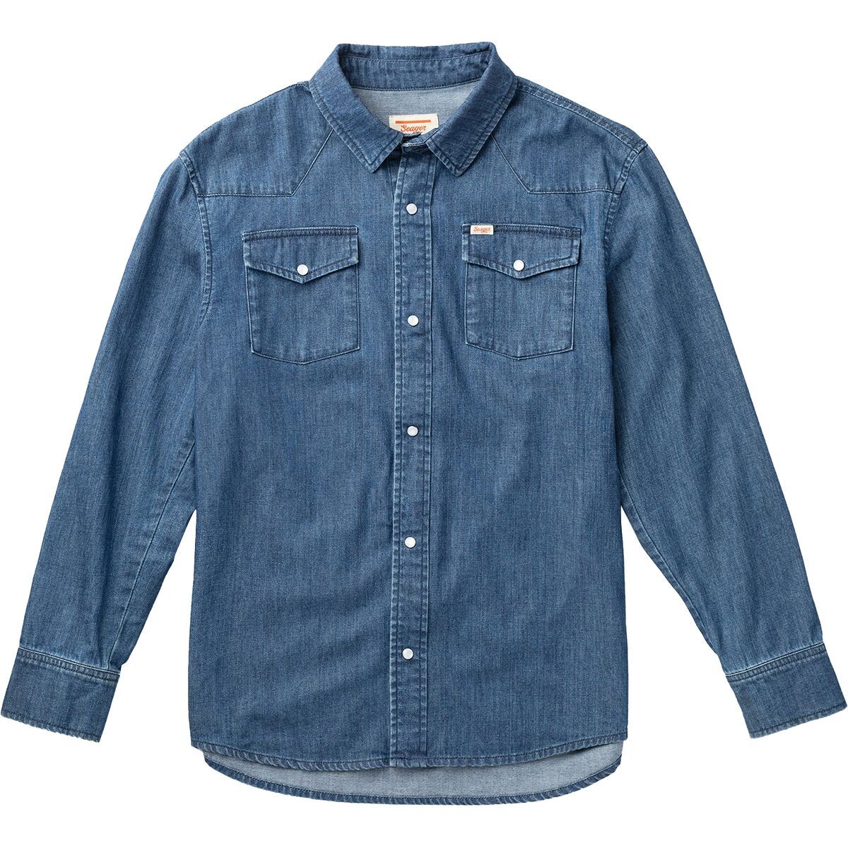 A traditional chambray shirt, the Seager Reagan Pearl Snap Shirt features a classic Western yoke and pearl snap buttons for a cowboy-style look.