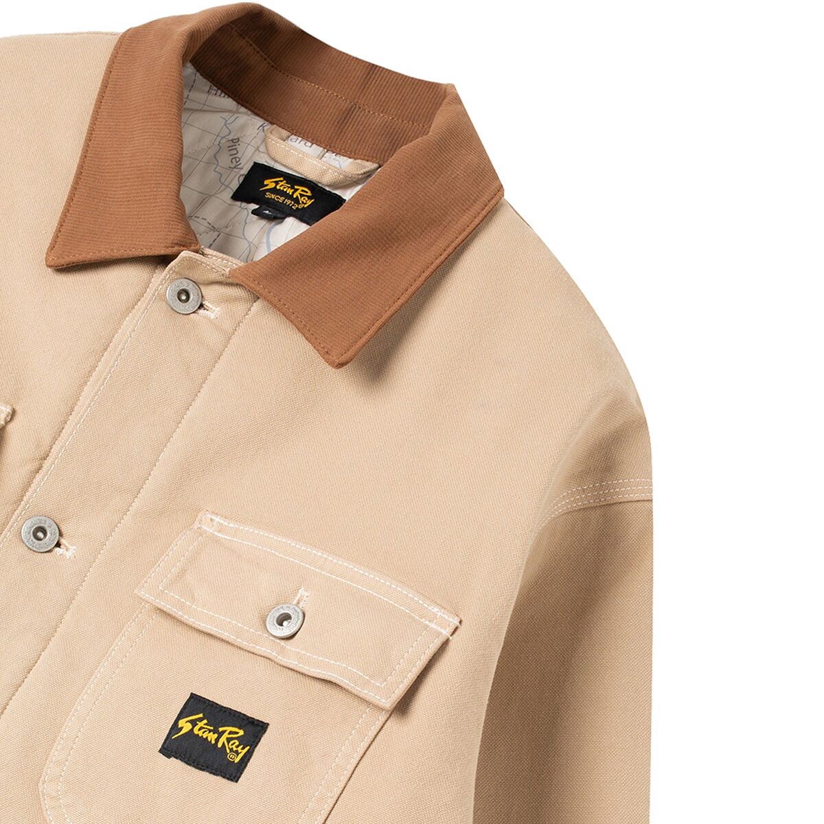 Lined internally with 100 Gsm and Crockett map print. Featuring elasticated cuffs, easy access pork chop pockets with embossed Stan Ray snaps, double chest pockets.
