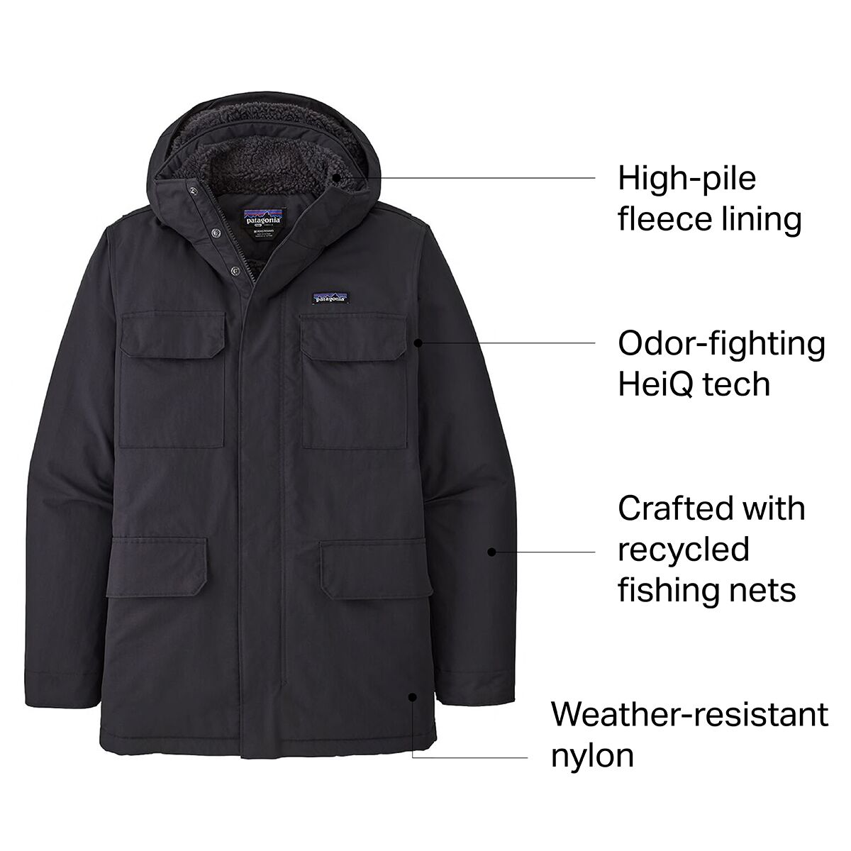 The tough, winter-ready Isthmus Parka from Patagonia is our everyday choice for cold-weather adventure. Newly crafted with recycled fishing nets, the weather-resistant nylon shell keeps us protected in light rain and wintry wind. High-pile fleece lines the body and the hood for soft, warm comfort, and insulated sleeves lock in heat on cold shoulder-season expeditions.