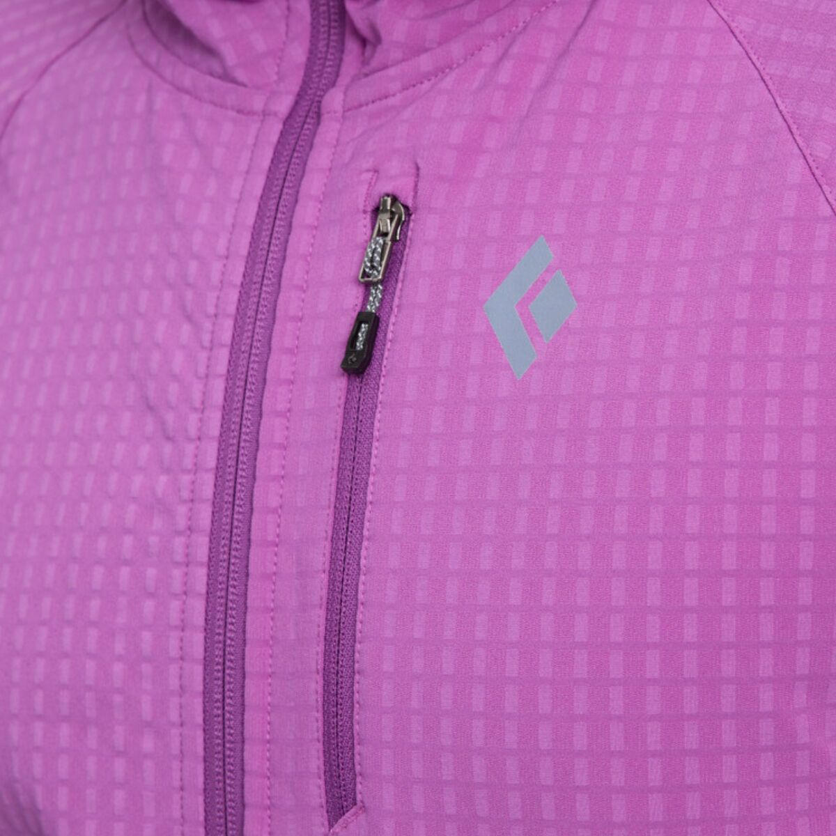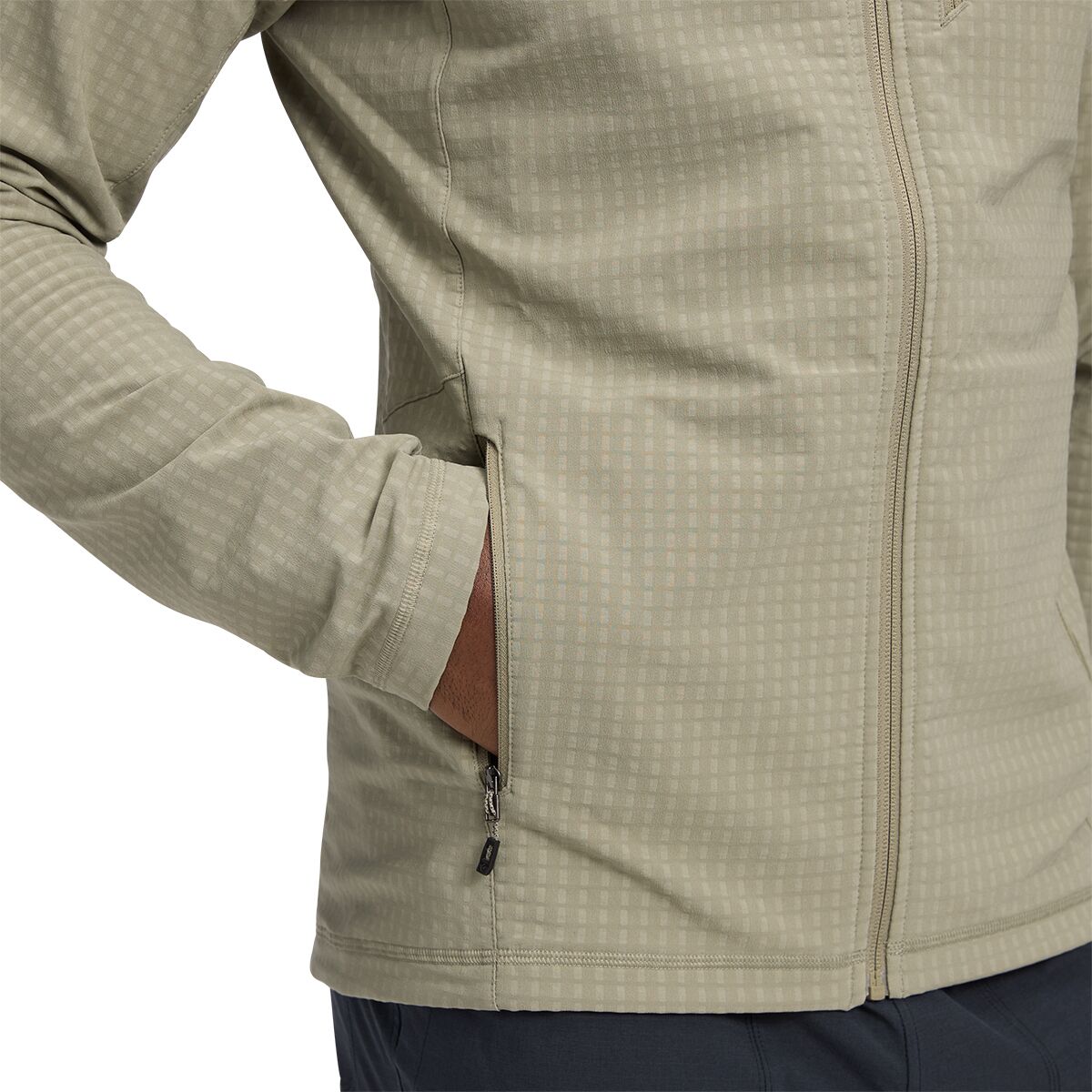 The gridded fleece interior traps heat while still letting moisture escape, and the stretchy outer fabric moves with us whether we’re skinning, scrambling, or hauling gear. It even packs into its own pocket with a loop for clipping to our harness or pack. Lightweight, versatile, and weather-ready, this layer works just as well on alpine starts as it does for coffee in town after.