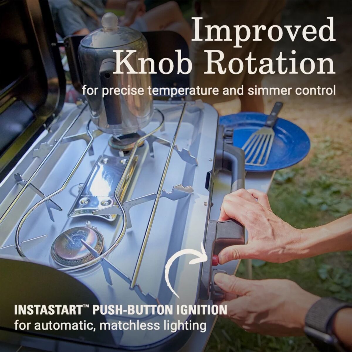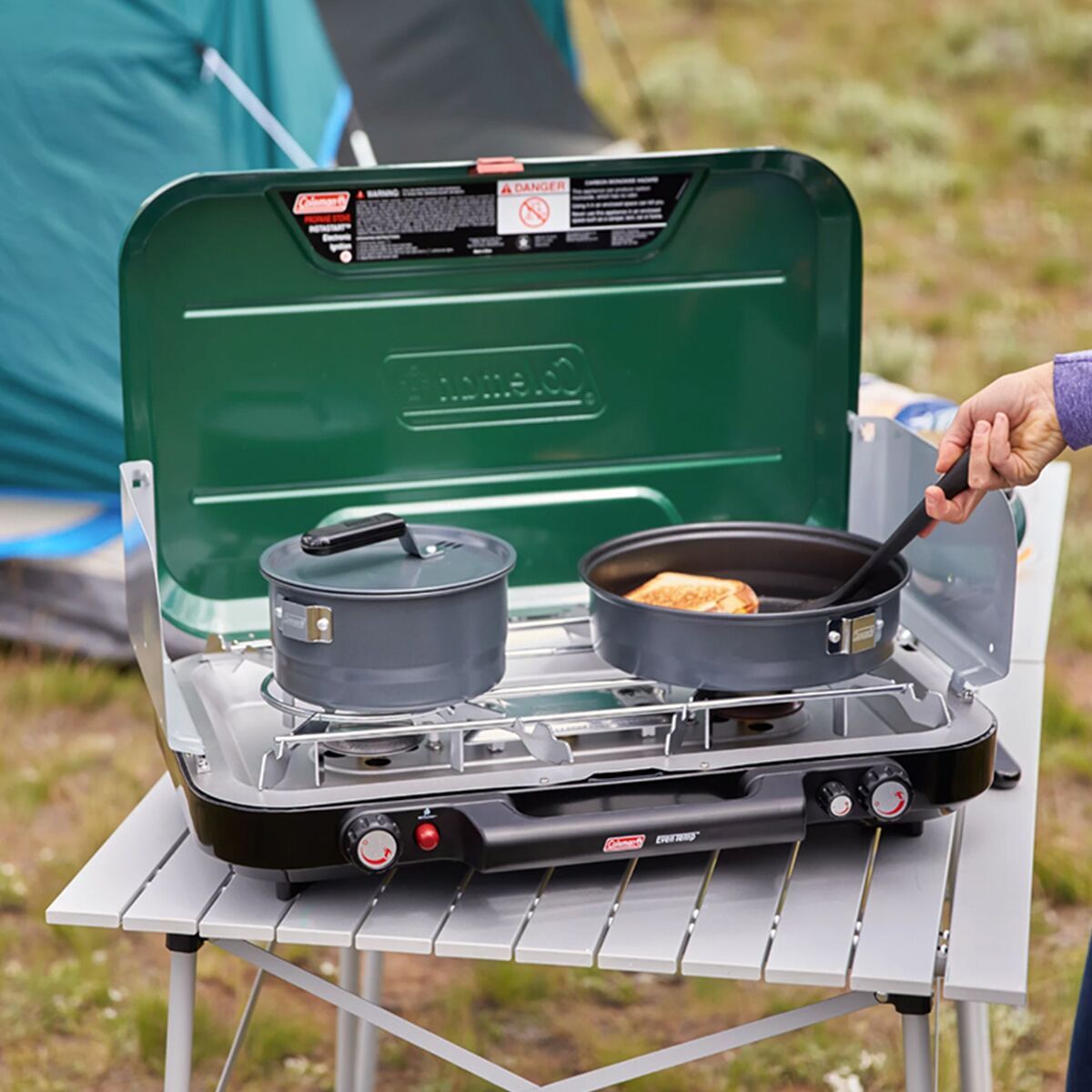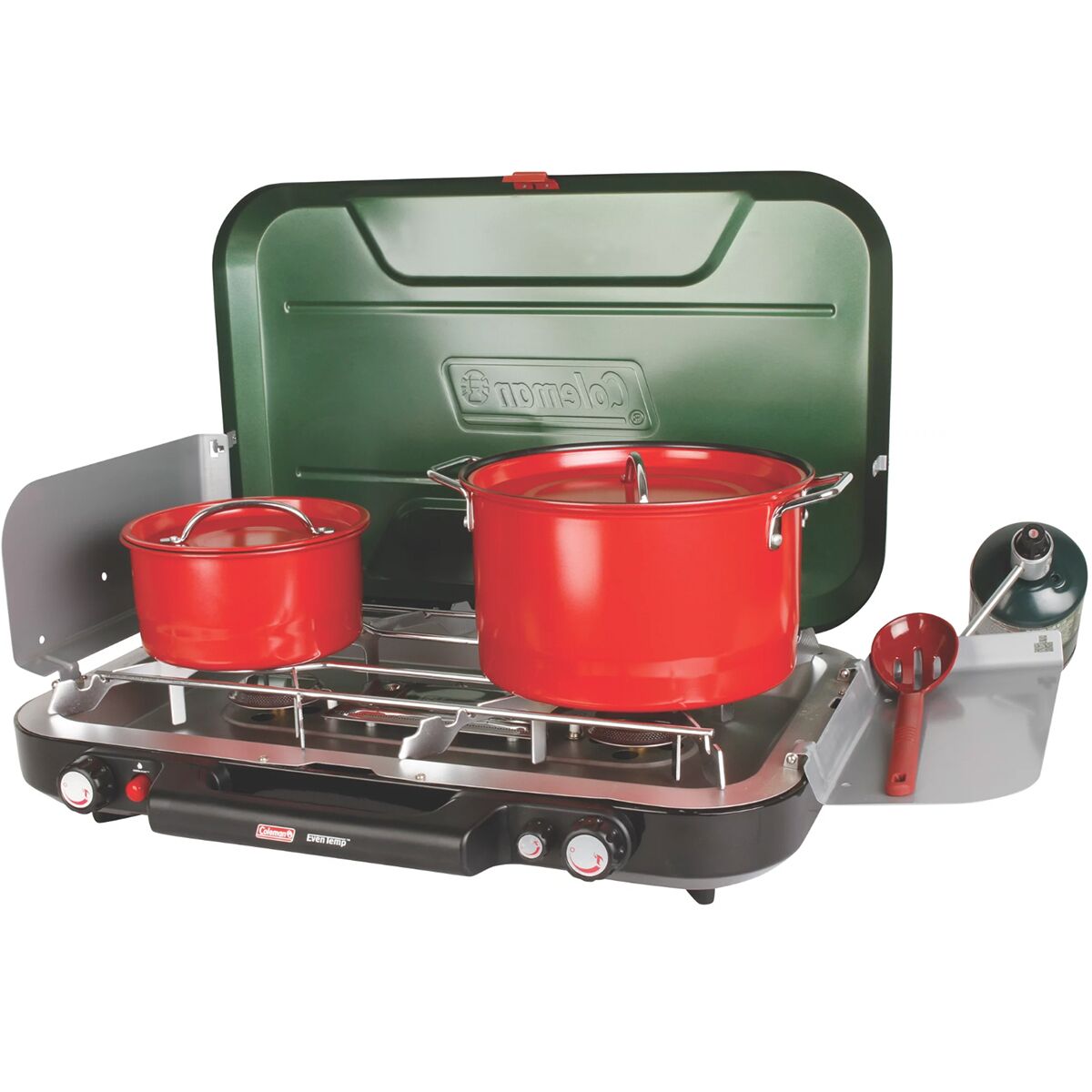 Designed for cooking grandma´s old recipes in the beauty of the outdoors, the Coleman Eventemp 3 Burner Stove offers a comfortable cooking experience. The large dimensions and 3-burner design allows us to use two 12in pots, or 3 8in pots at the same time, while the windscreen keeps the burner lit, and the Instastart ignition allows you to light it effortlessly the first time.