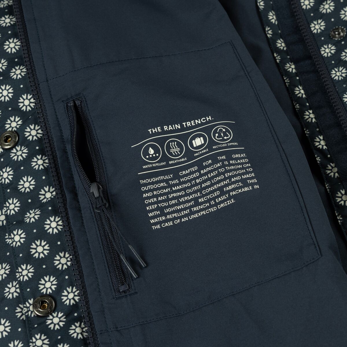 We love its breathable recycled fabric, which keeps moisture at bay while allowing air to flow, preventing that clammy raincoat feel. Whether we’re layering it over a sweater on crisp days or packing it away when the sun comes out, The Rain Trench is the stylish solution for unpredictable weather.