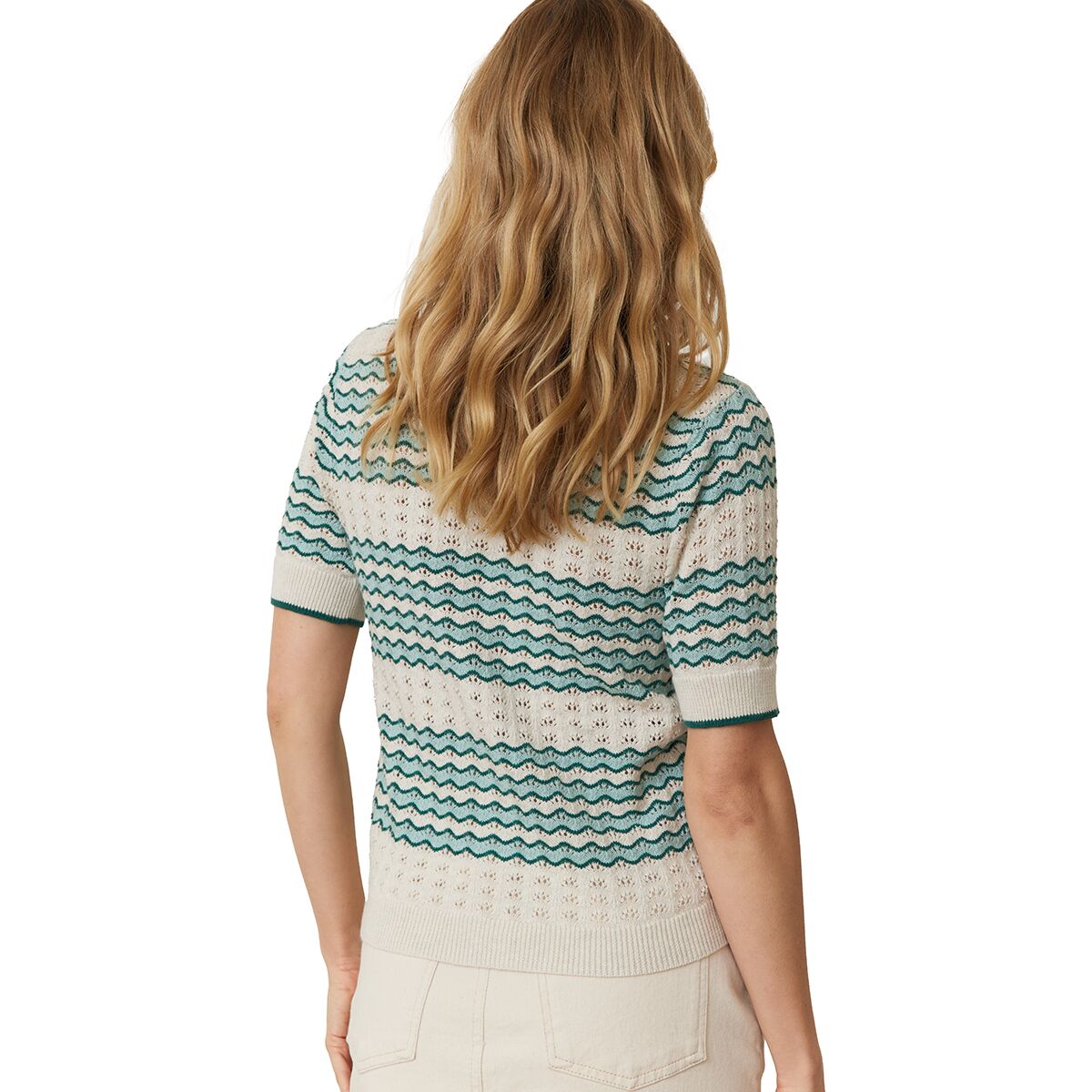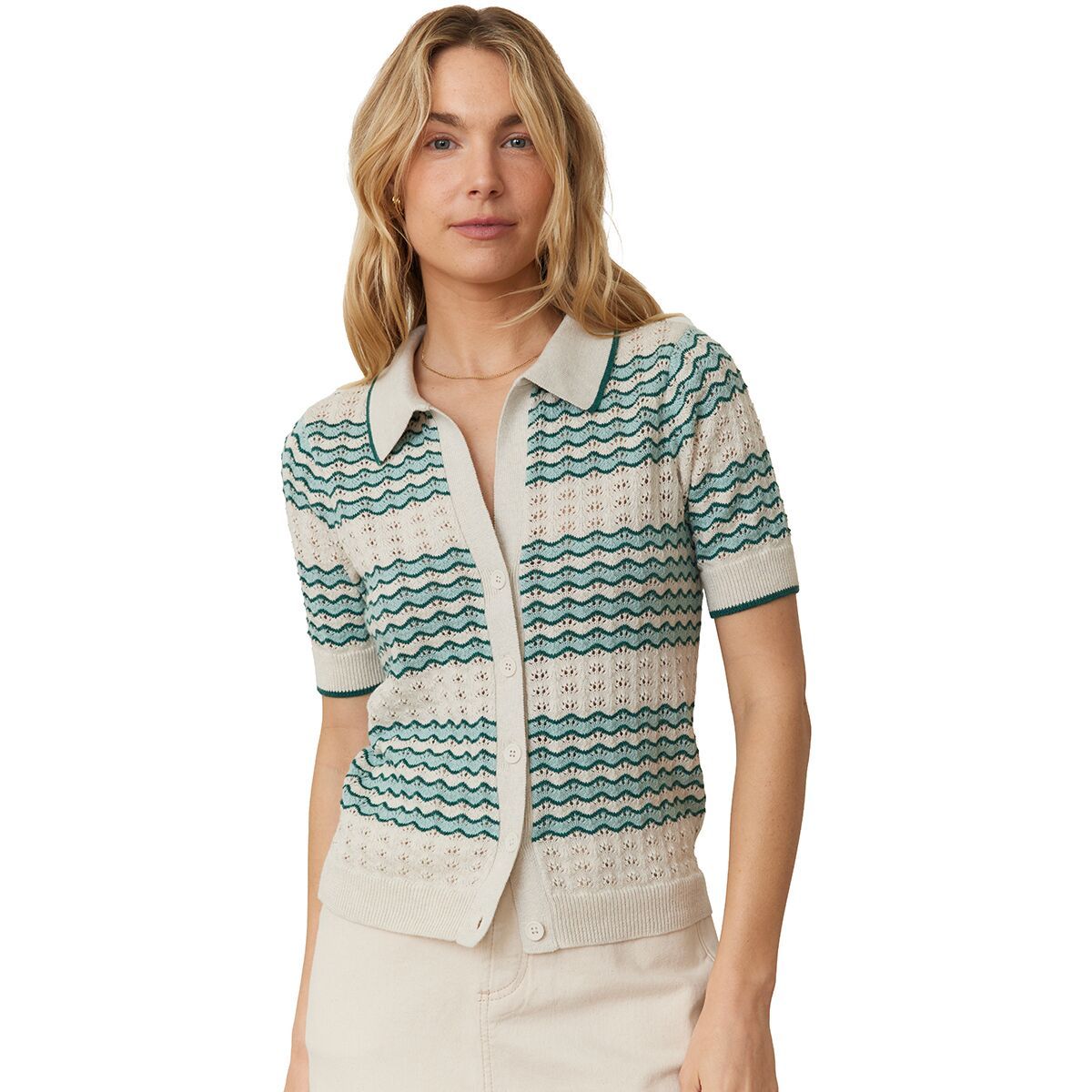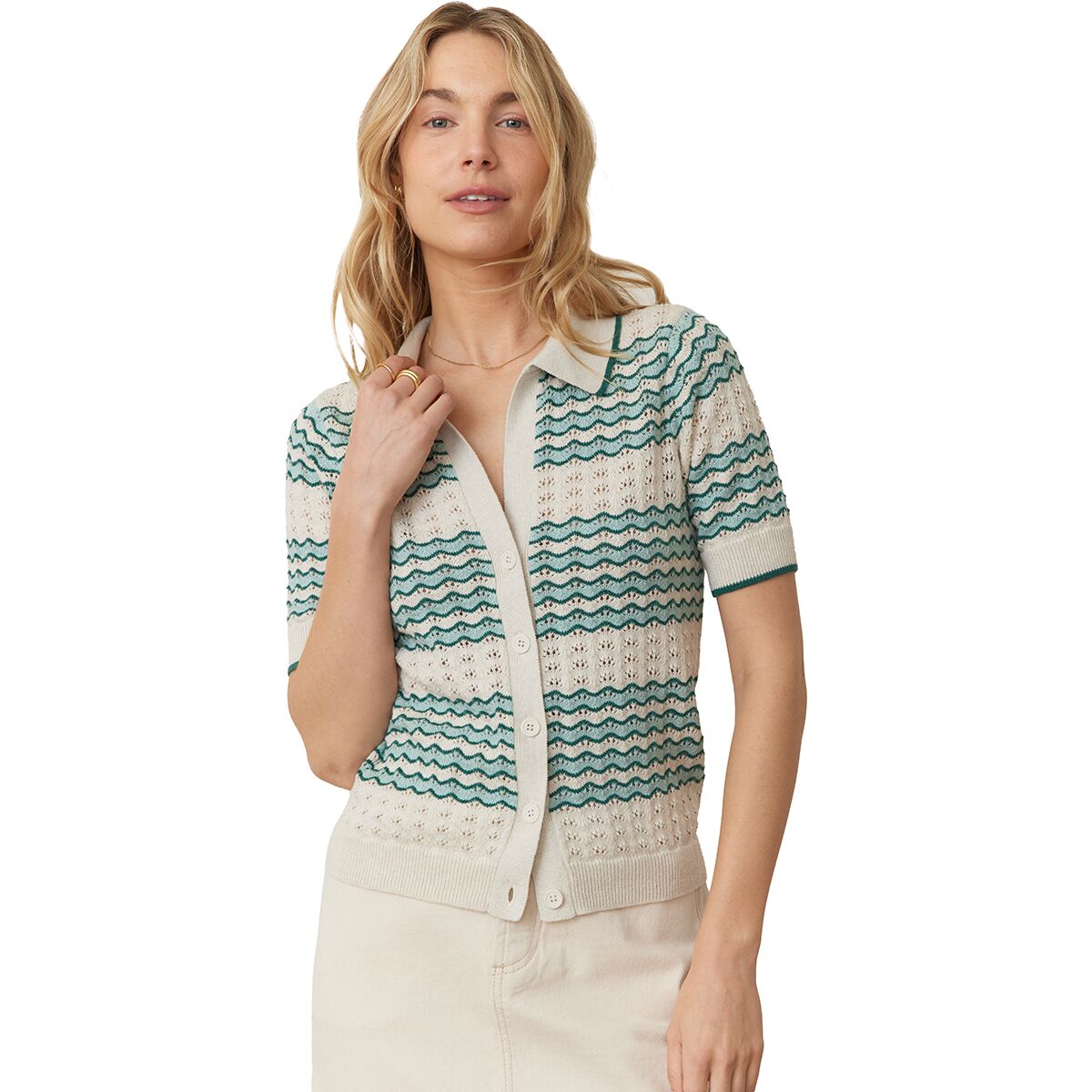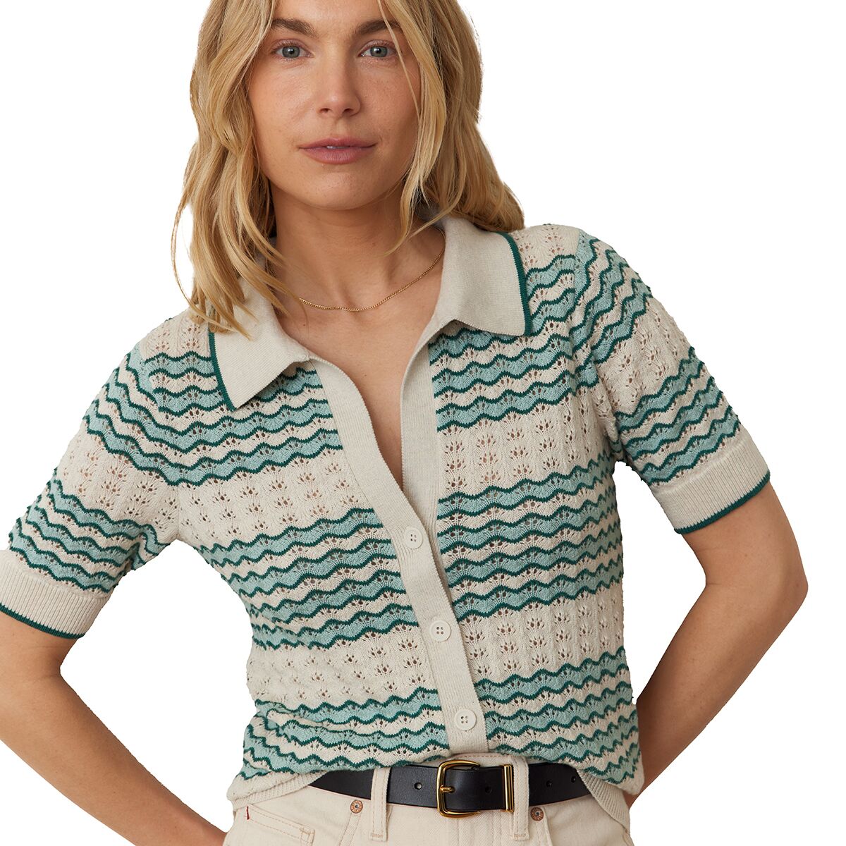 "This sweater polo is the perfect mix of vintage style and everyday comfort. The crochet-like pointelle stitching gives it an airy, lightweight feel, and the relaxed fit makes it super easy to wear. Whether I’m layering it over a tank or wearing it on its own, it’s one of those pieces that instantly makes an outfit feel more put together."