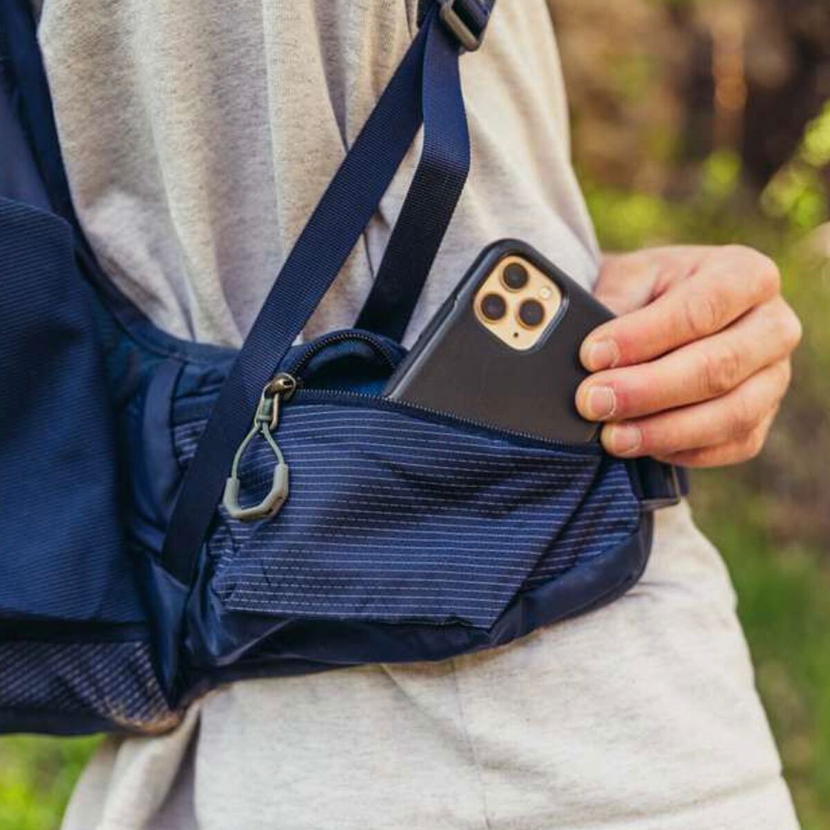 - 2 zippered hip belt, 1 zippered front, 1 zippered top, 2 stretch mesh side