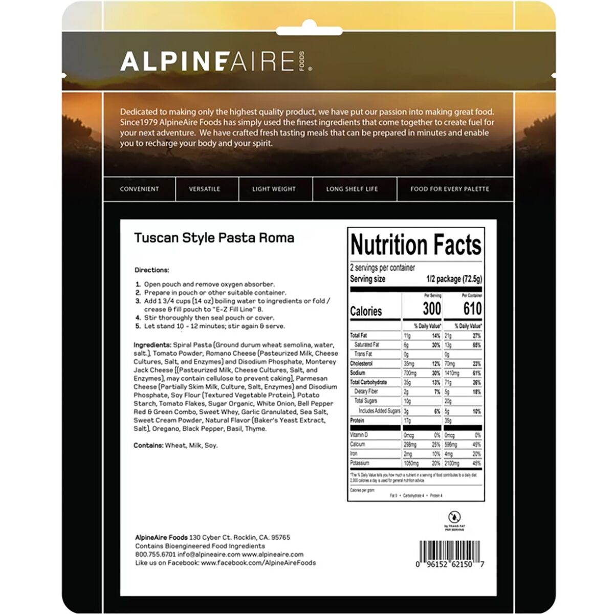 Classic Italian flavors meet backcountry convenience in AlpineAire’s Tuscan Style Pasta Roma. A rich and creamy tomato-based sauce is infused with basil and blended with Parmesan and Romano cheeses, coating high-quality pasta for a warm, comforting meal.