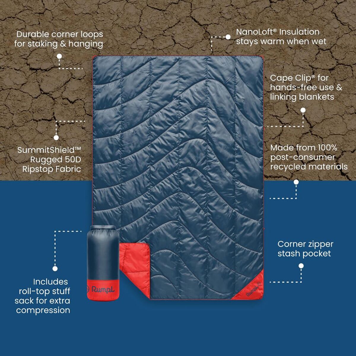 Super-toasty, ultralight, highly compressible, and surprisingly durable, Rumpl´s Backcountry Puffy 2-Person Blanket is meant for both rugged adventures and nomadic van life. Rumpl updated their proprietary NanoLoft insulation, making it loftier and partially plant based to combat clumping and enhance heat retention all at a lower environmental cost, and they packed this fill inside their featherweight SummitShield fabric that resists tears and moisture for a cozy experience that lasts.