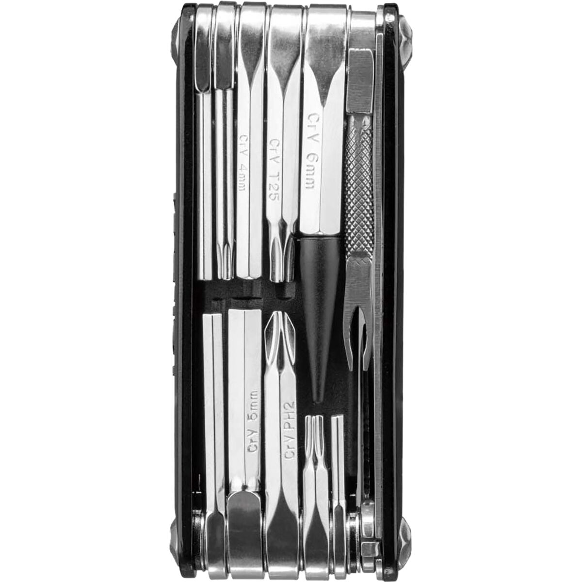 18 function, pro-quality, precision mini tool with integrated tubeless tire repair functions.