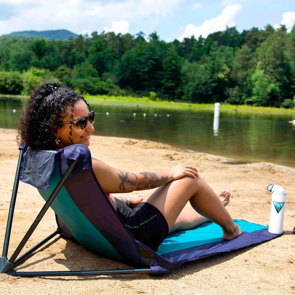 • On-ground lounger combines elements of a beach blanket and a camp chair