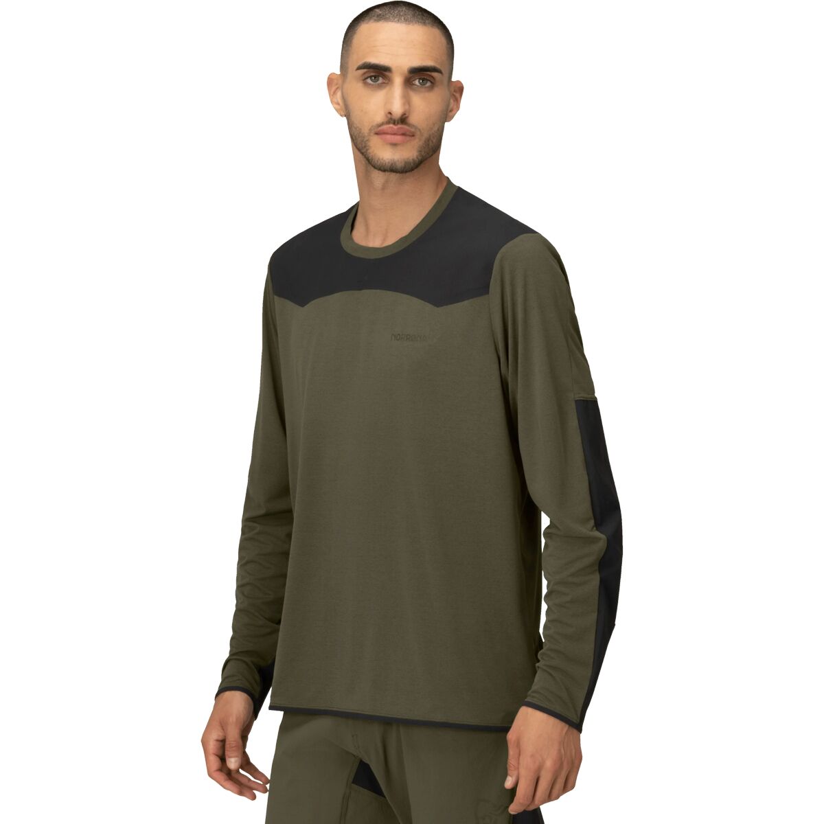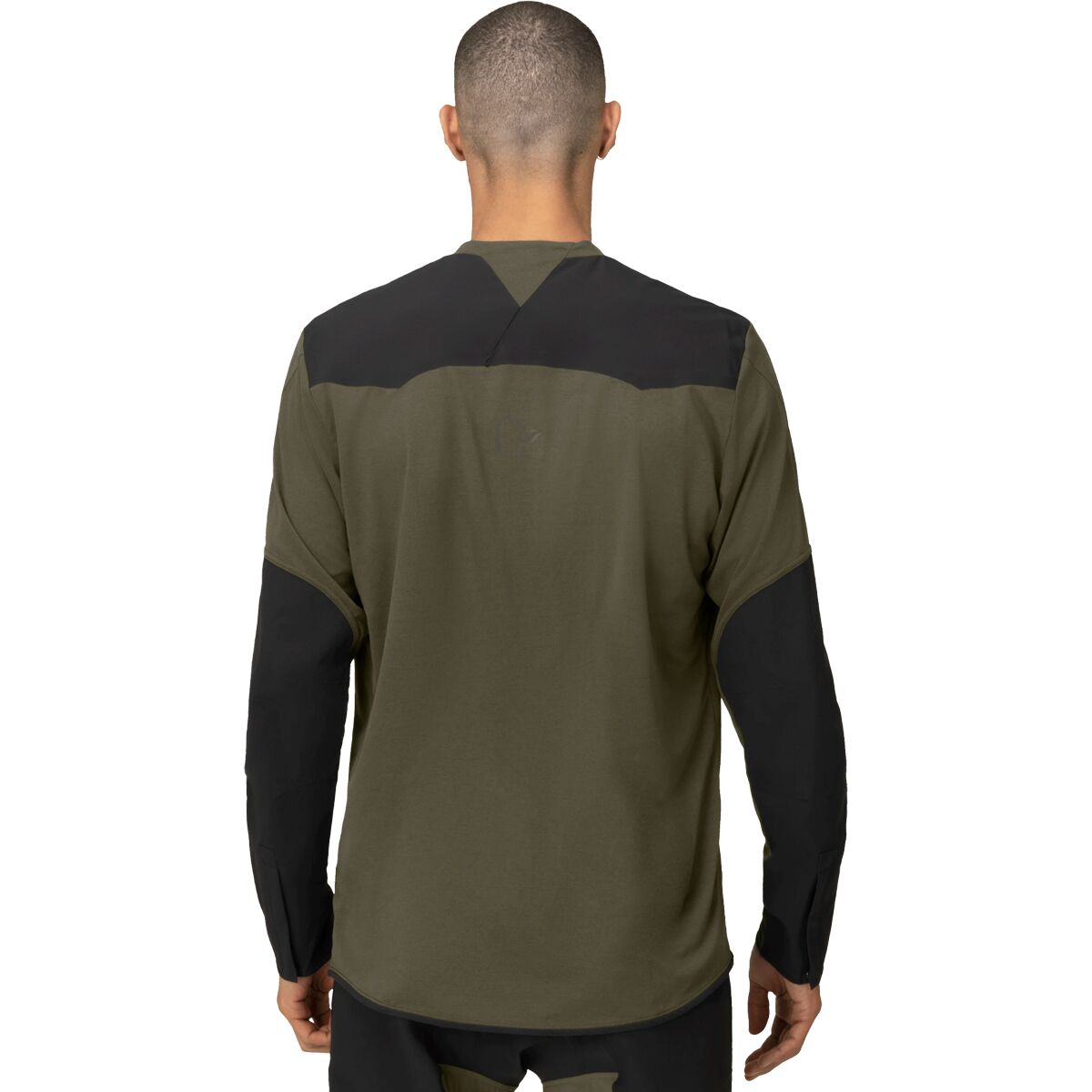 The main material is 100% recycled polyester 113 g/m2. It has been treated with HeiQ Fresh FFL anti-odor treatment. HeiQ Fresh FFL is a bio-based amino sugar polymer that is silver-free and not an antimicrobial. It removes the fat and protein from sweat, thereby eliminating the ability of the bacteria to grow and therefore reduce odor. On the elbows and cuffs, we use a ripstop 85% recycled nylon/15% elastane Flex1 blend 162 g/m2.