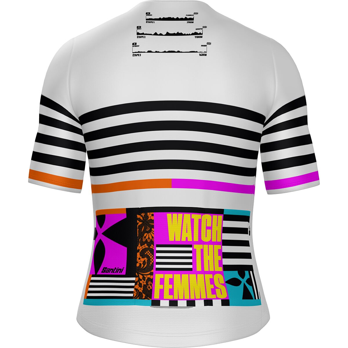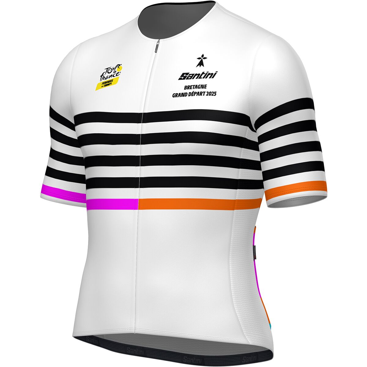 For the first time in Tour de France history, the race kicks off in Italy—and the Santini TDFF Grand Depart Bretagne Jersey captures that monumental moment with bold design and high-performance fabric. The jersey’s focal point is a vibrant seven-circle motif, where one stands out in iconic yellow and the others celebrate the national colors of France and Italy. From the names of host cities to the altitude profiles of the first three stages, every detail is woven in to celebrate the 2025 Grand Départ.