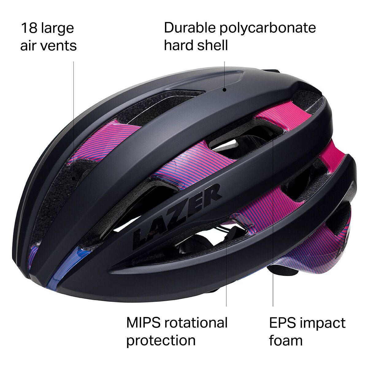 • Channeled ventilation with 18 total vents for airflow