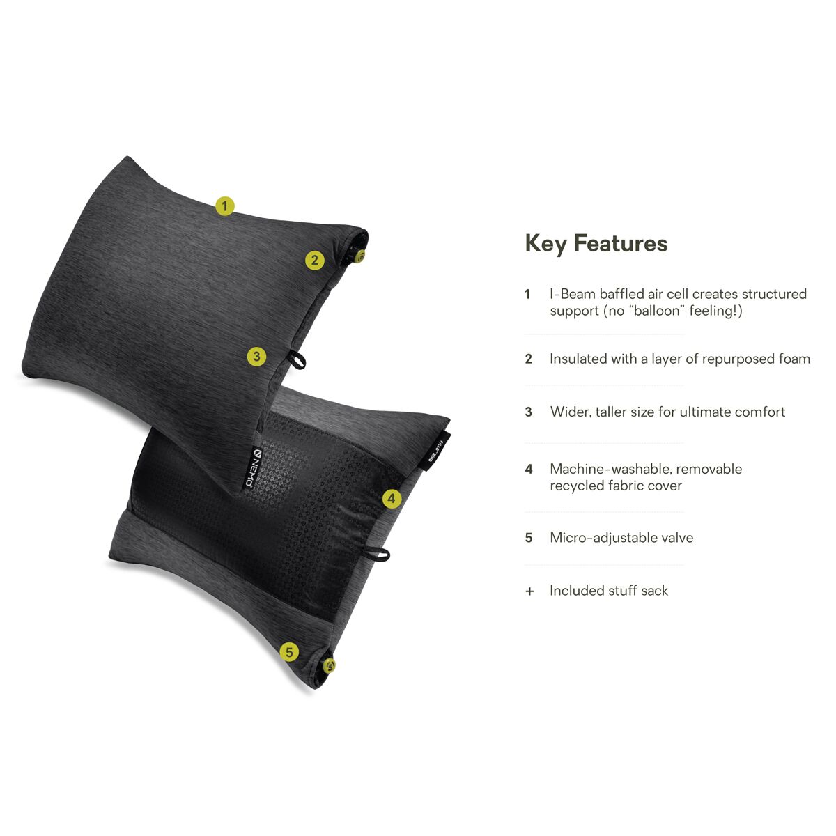 - Integrated stuff sack keeps the pillow compact and organized for travel