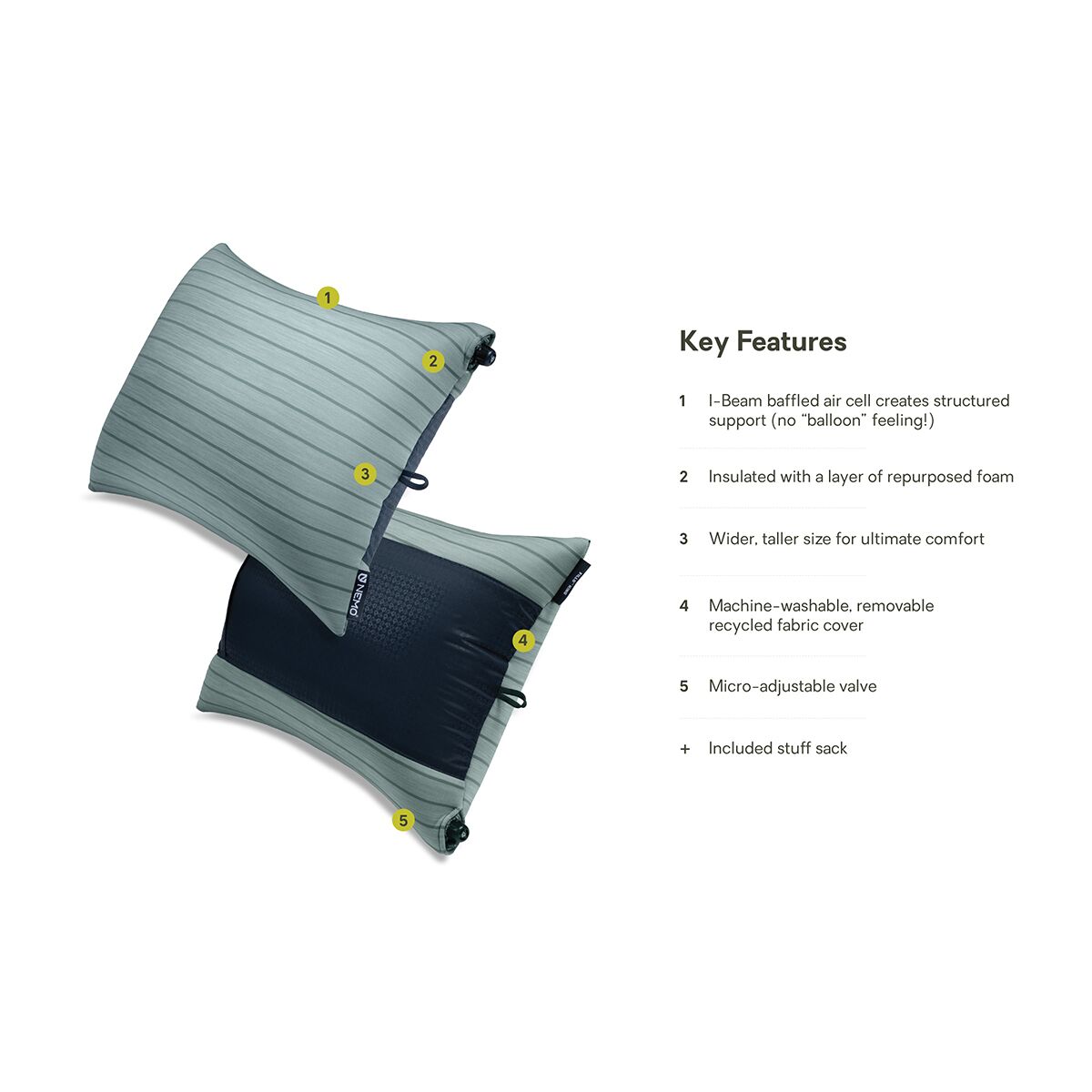 - I-beam baffled air cell eliminates balloon feel and retains natural pillow shape