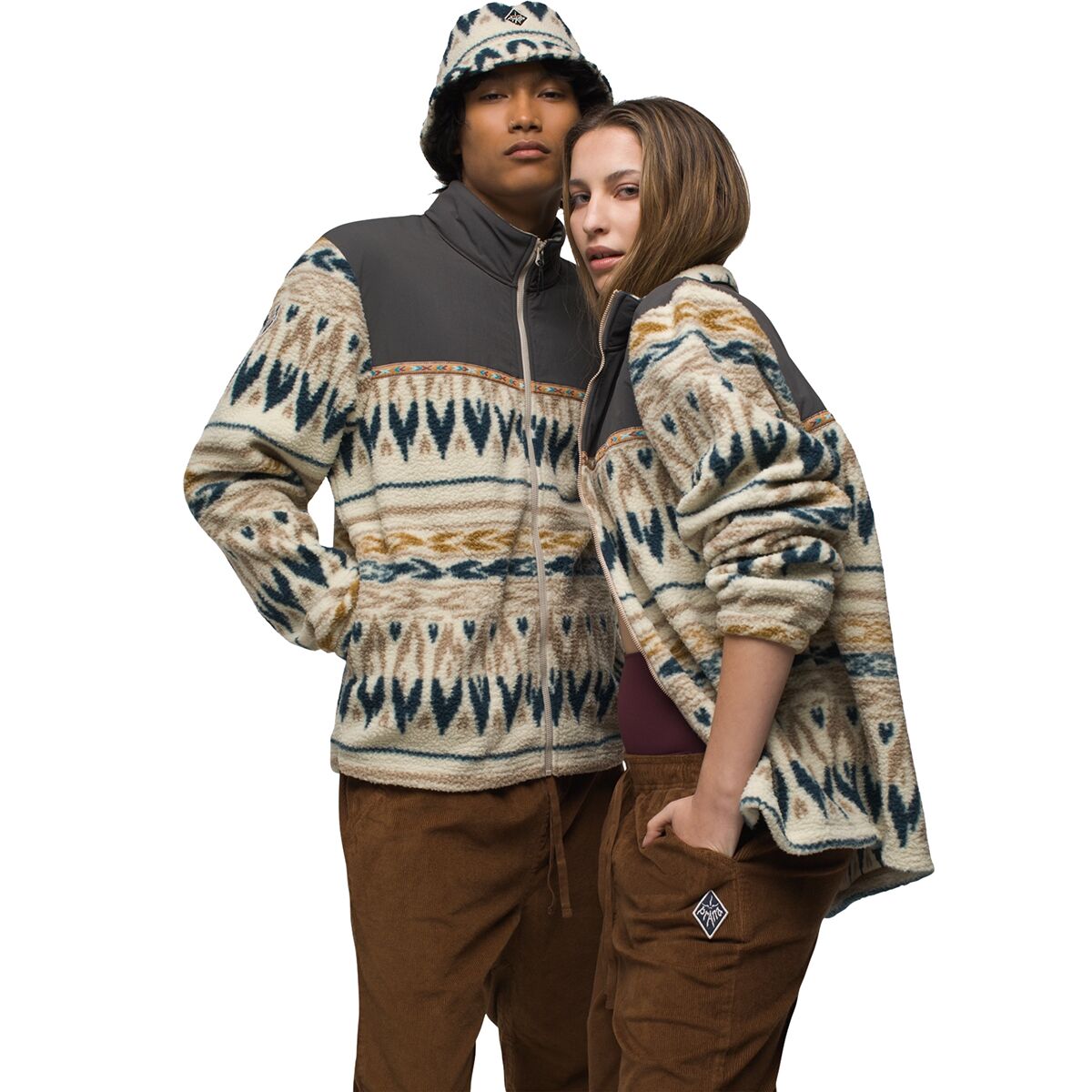 The prAna Hurricane Full-Zip Fleece features heritage vibes with its polyester sherpa fleece, printed canvas body panels with jacquard woven taping, and a heritage patch on the right sleeve.