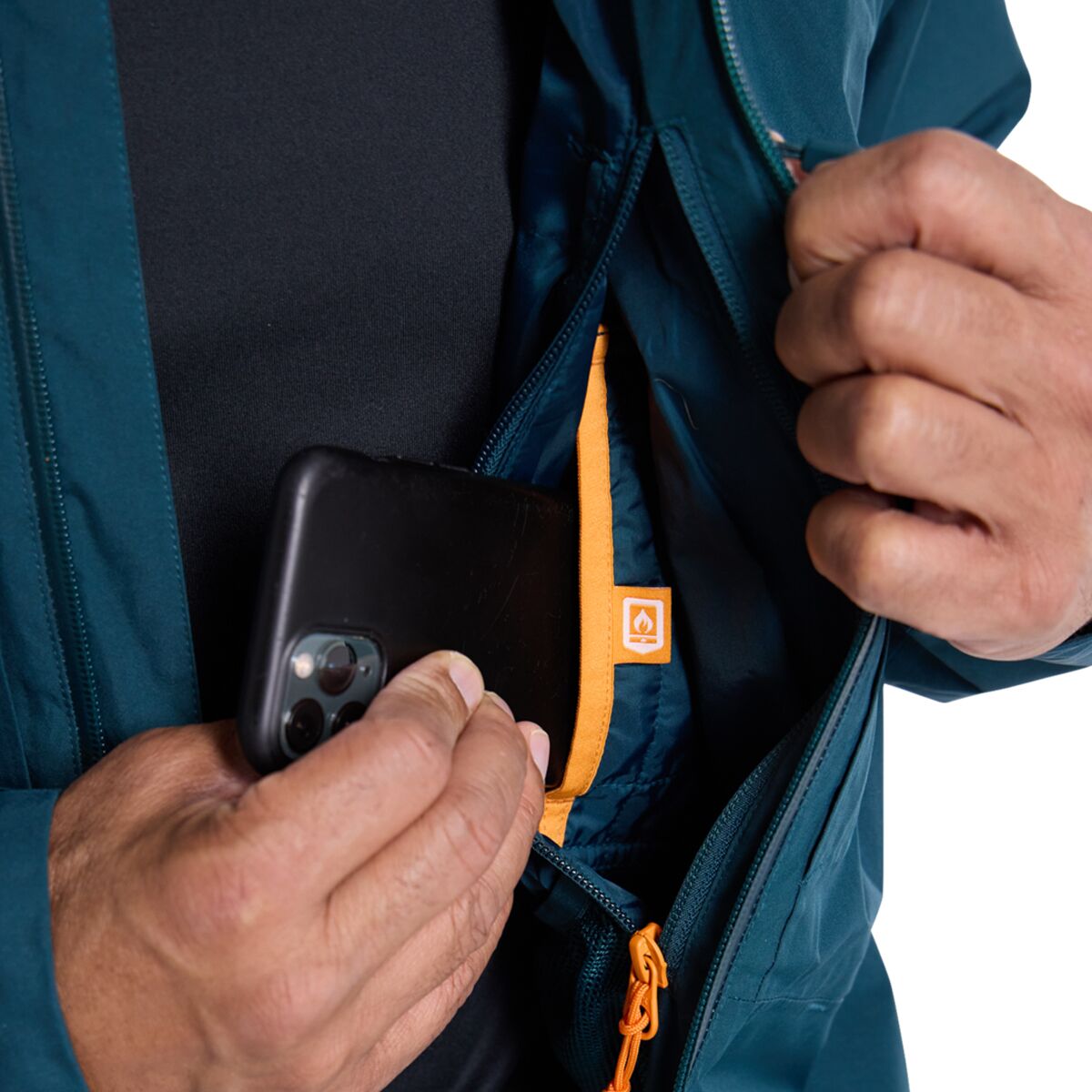 - [external] 2 zippered chest, 2 zippered microfleece-lined handwarmer, 1 zippered sleeve, [internal] 1 stretch mesh, 1 zippered chest (with thermal phone slot)