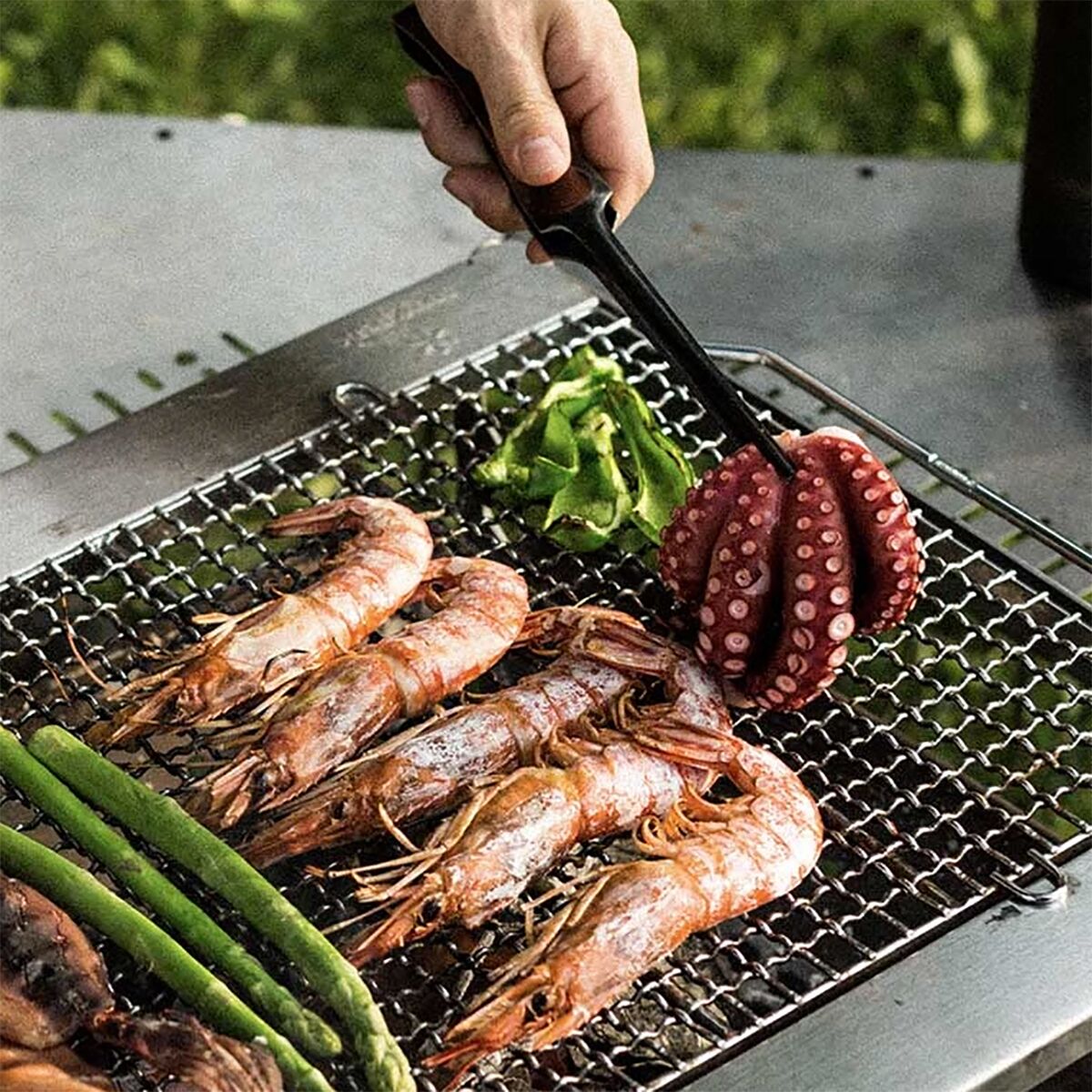 • Stainless steel tongs for easy cooking over the fire