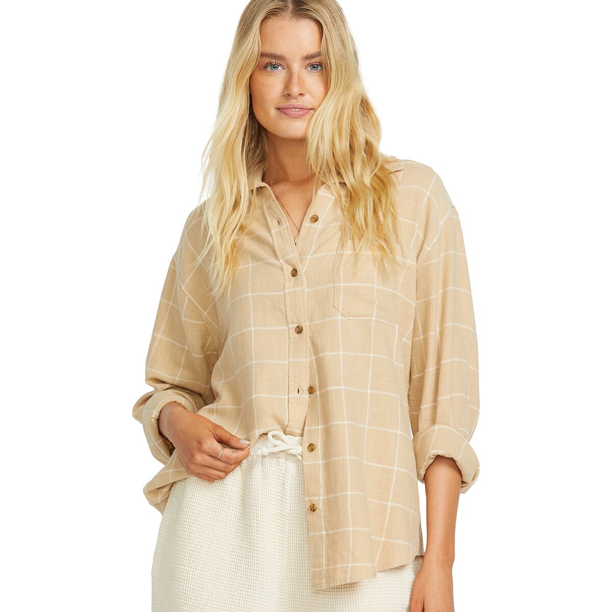 "The Layer Up Long Sleeve Woven Top is my go-to for everything from early morning hikes to chilly evenings around the campfire. Its oversized fit is perfect for layering, and the cotton slub flannel fabric strikes the ideal balance between lightweight breathability and cozy warmth. I especially love the added detail of the front patch pocket—it’s functional and stylish!"