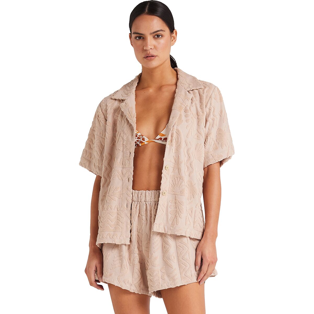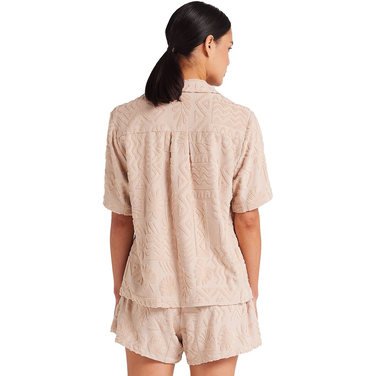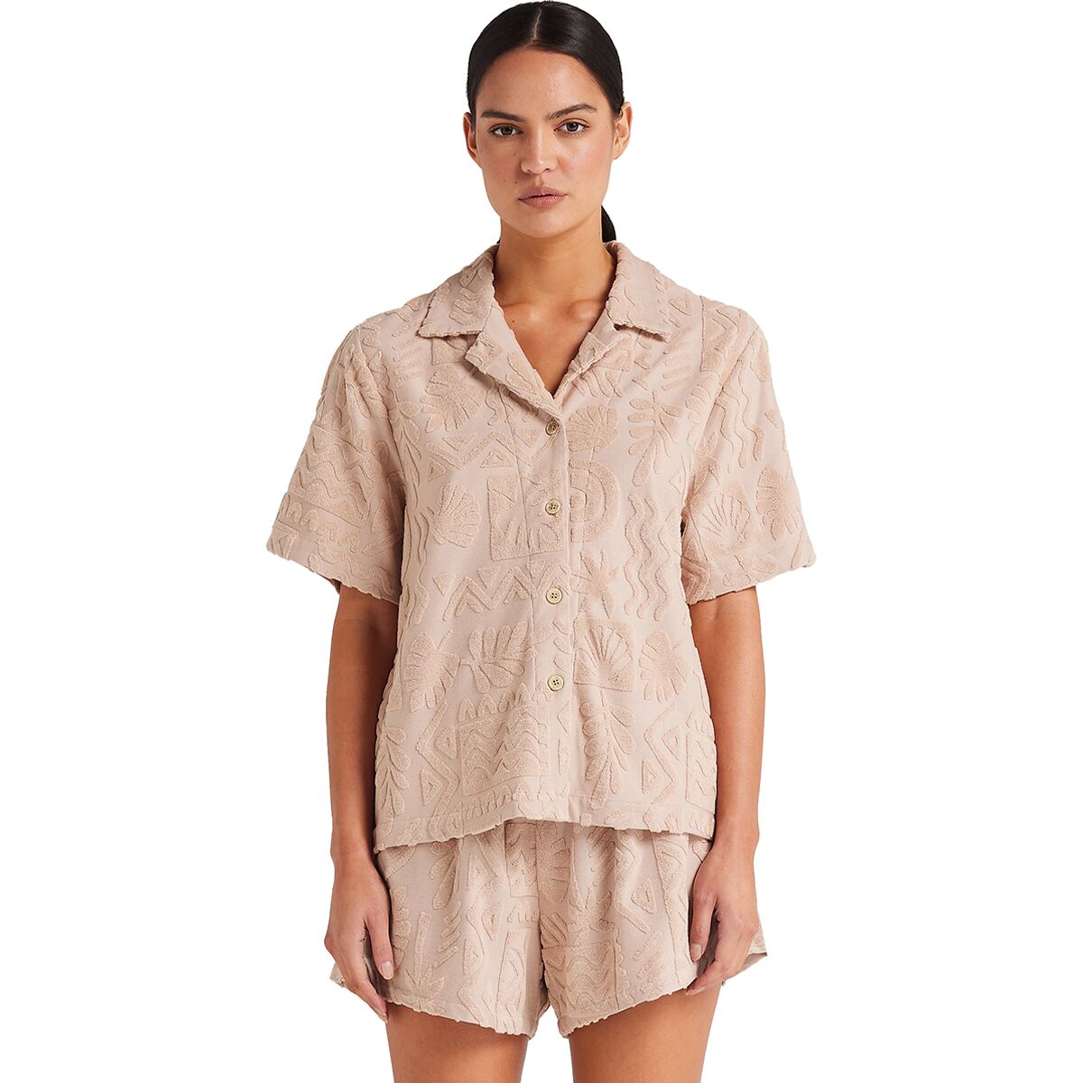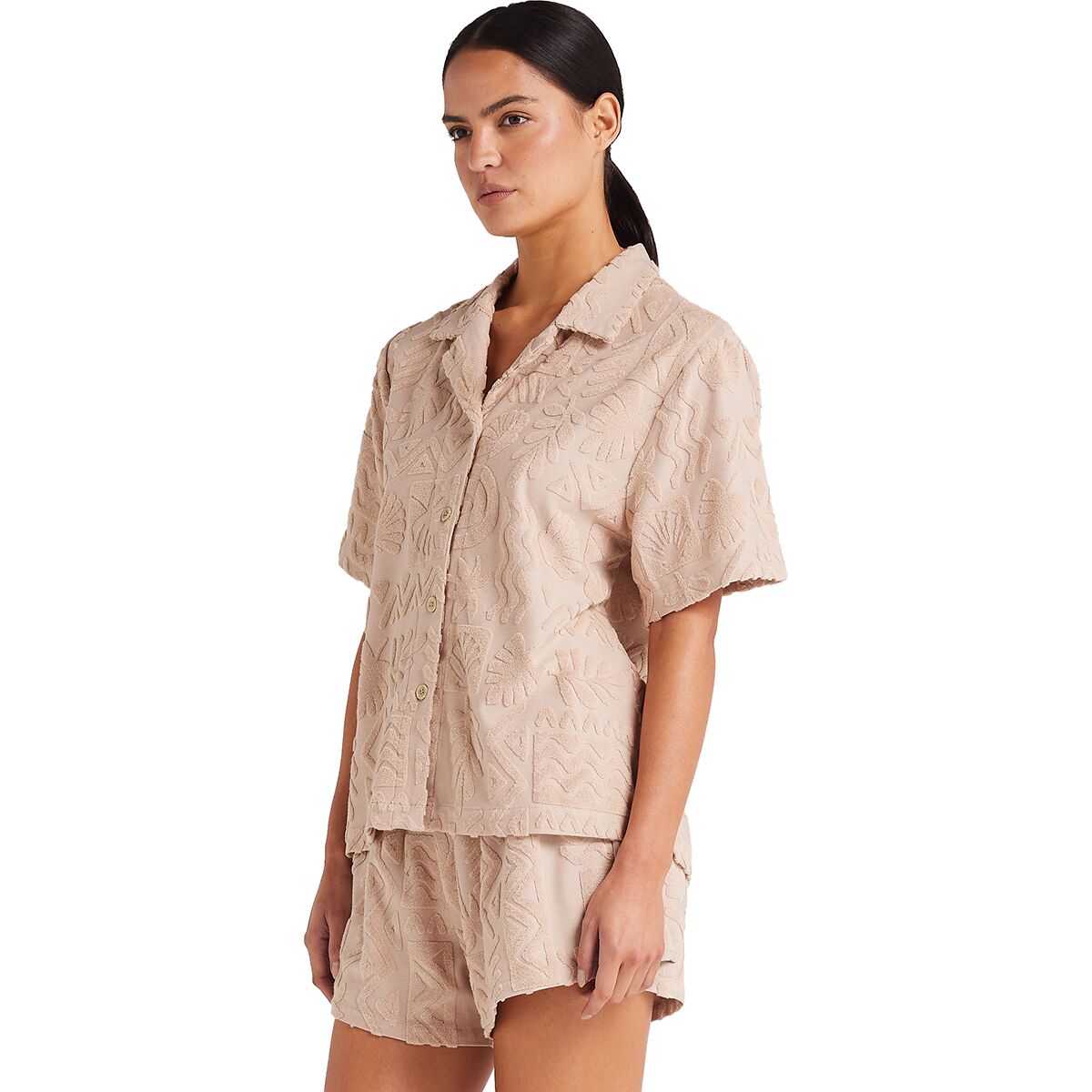 "This shirt is my new summer staple. The burnout toweling fabric is soft, breathable, and has that retro resort vibe. I wear it open over a swimsuit or buttoned up with the matching shorts—either way, it feels like vacation."