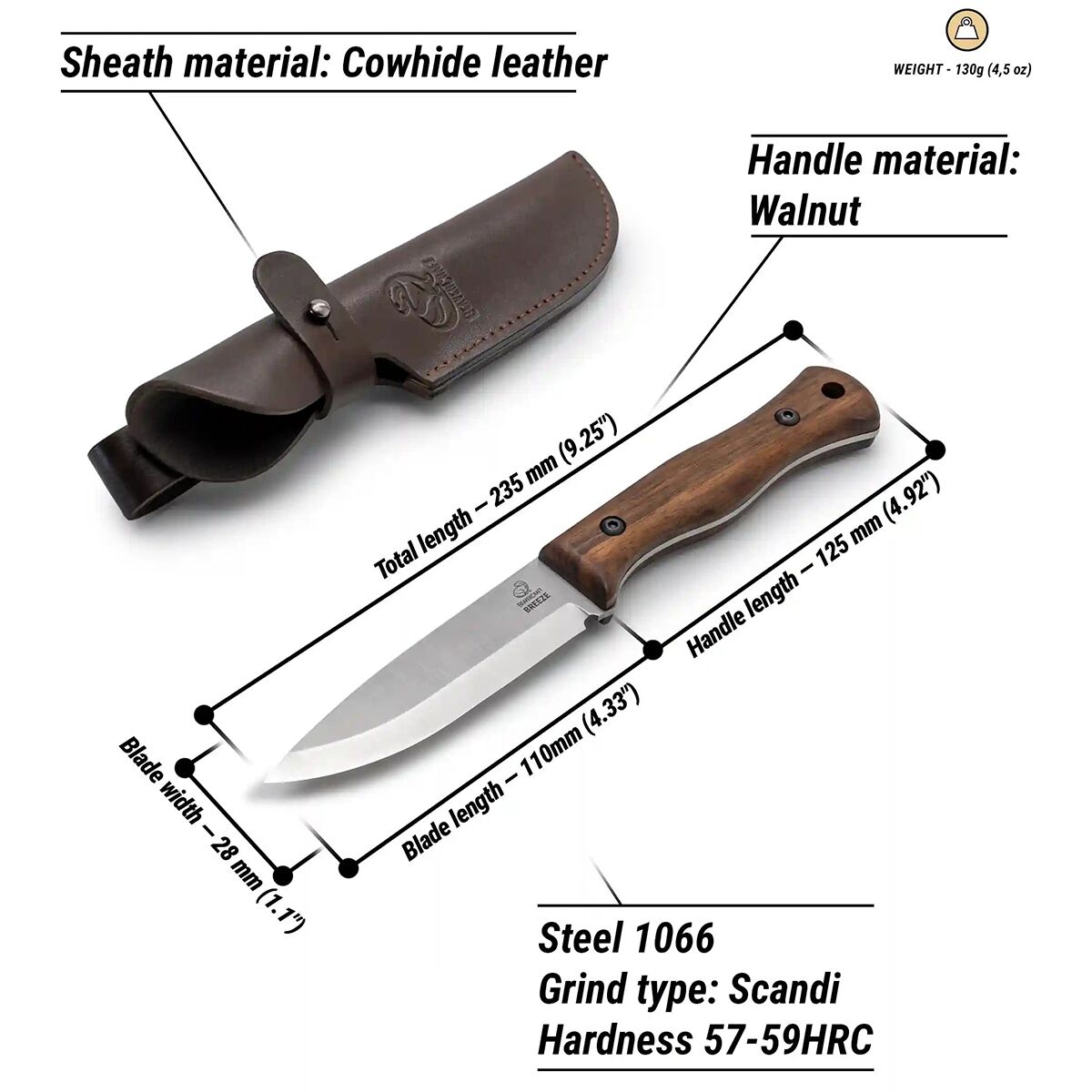 - Includes a cowhide leather sheath with belt loop for easy carrying