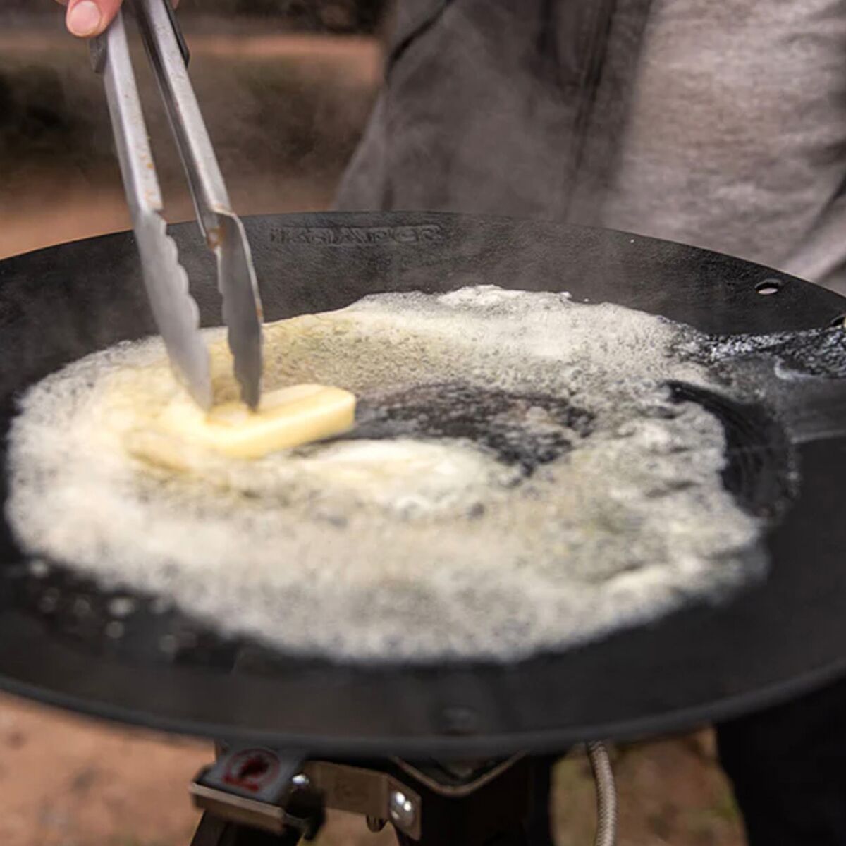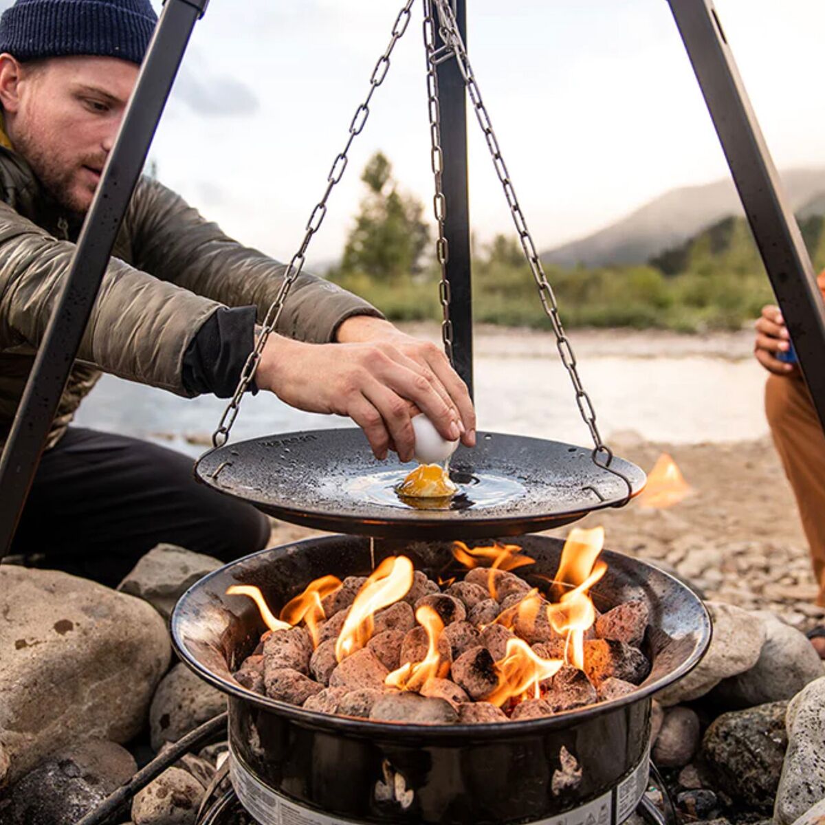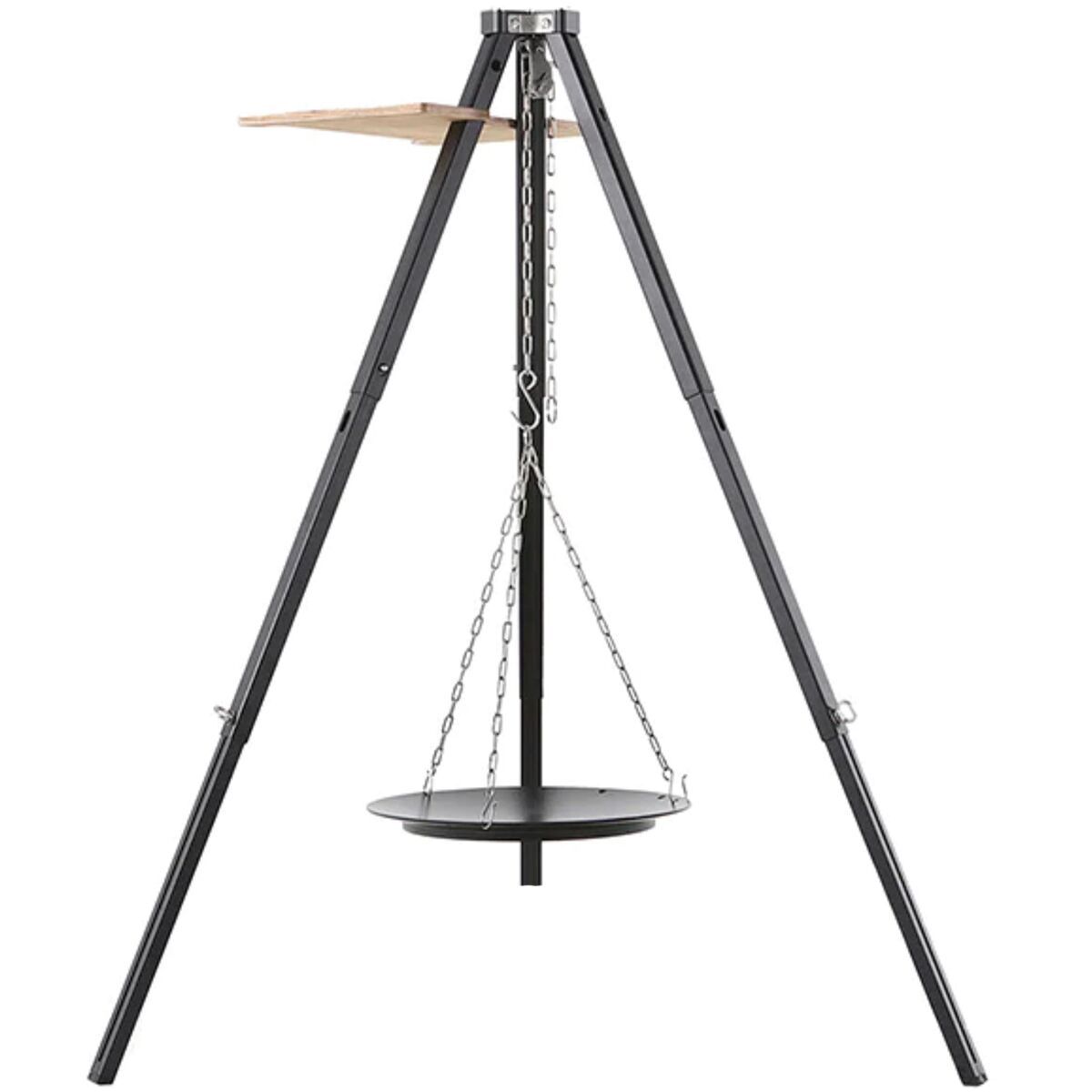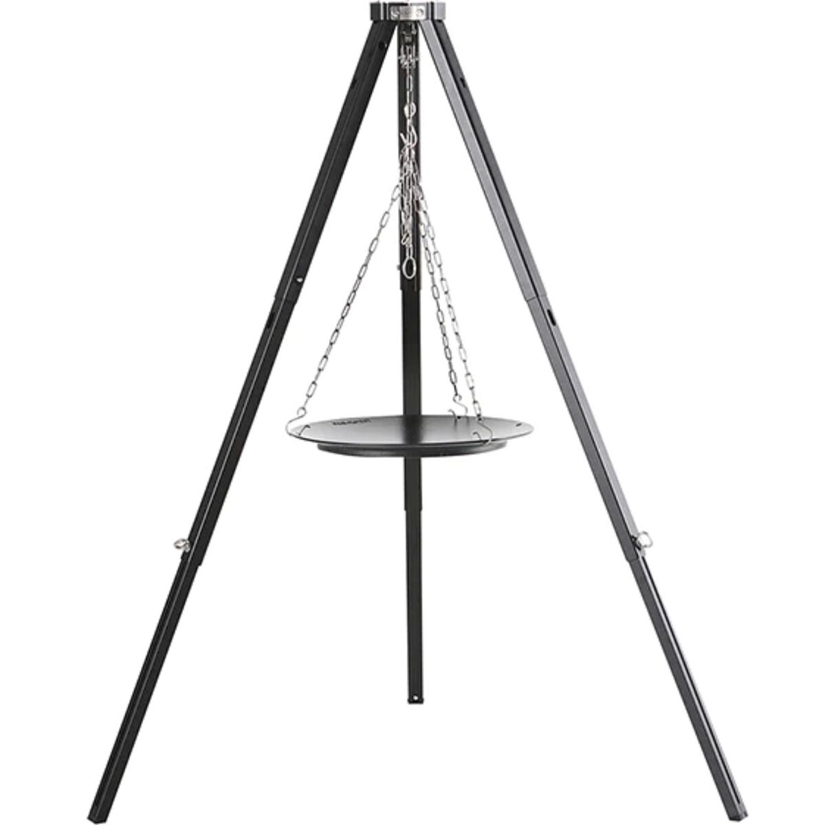 - Skillet can be hung from the tripod for cooking directly over a fire
