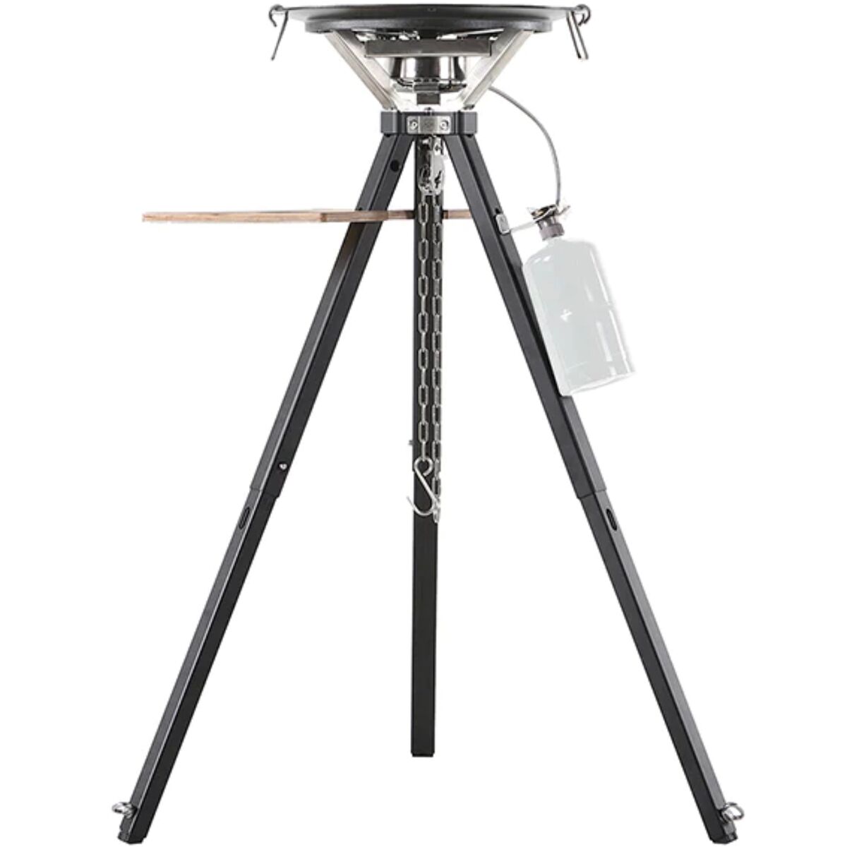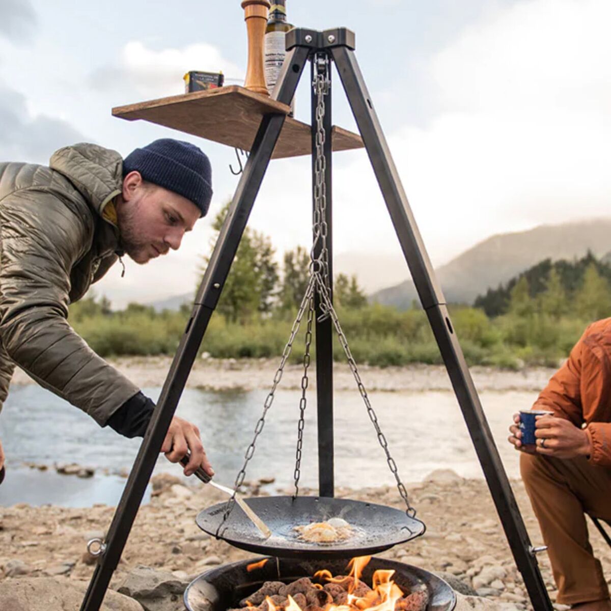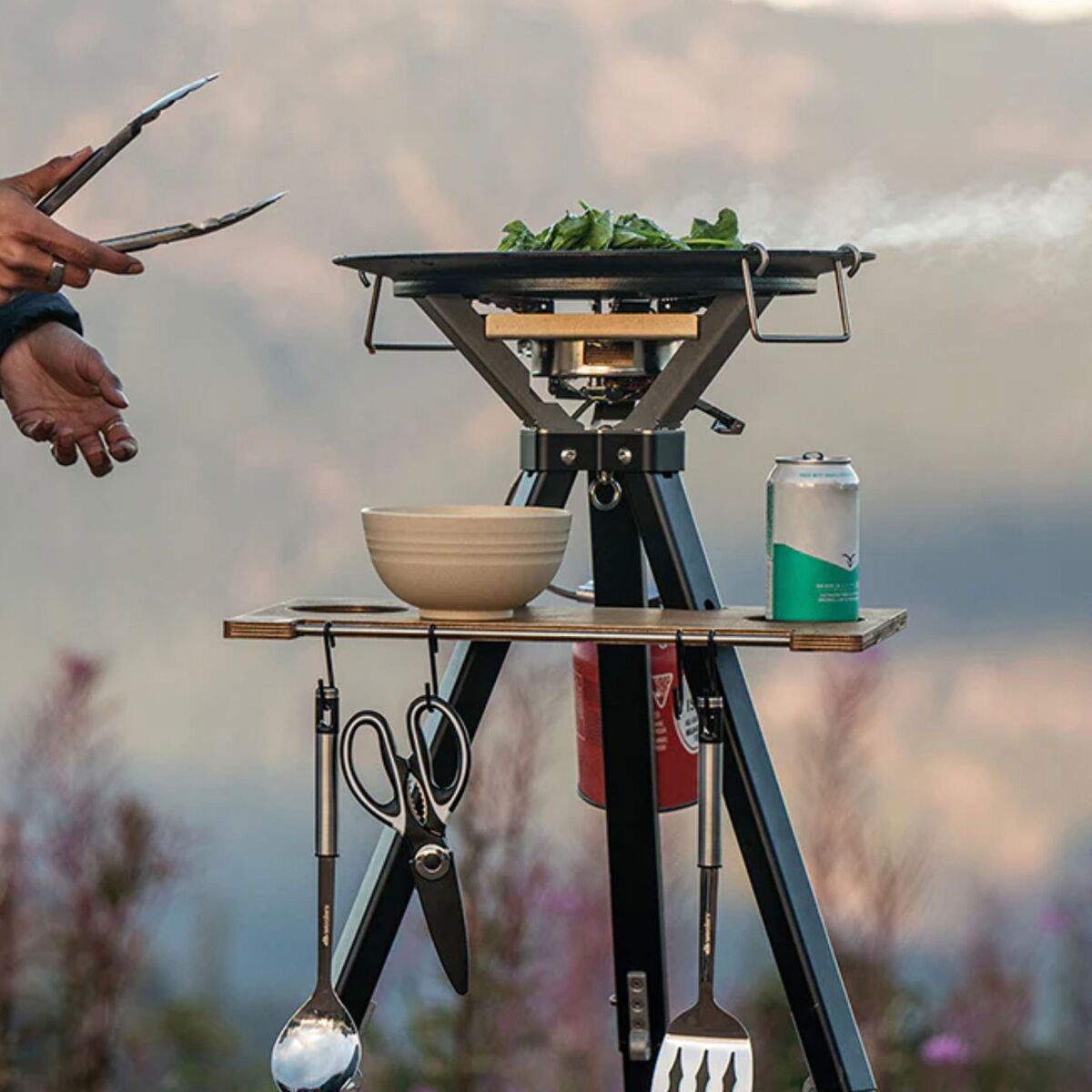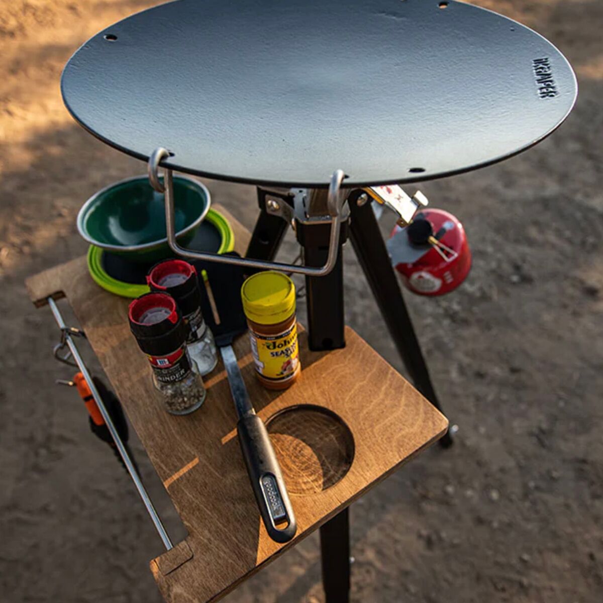 - [skillet] enamel-coated Meehanite cast iron, [tripod] anodized aluminum, [table] furniture-grade waterproof birch plywood
