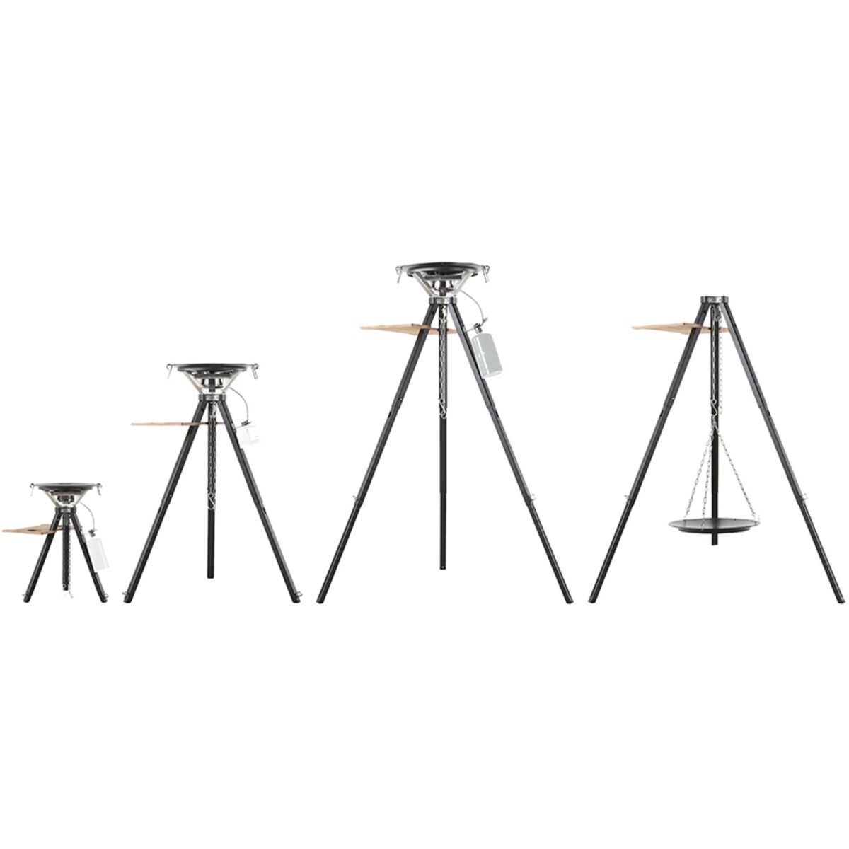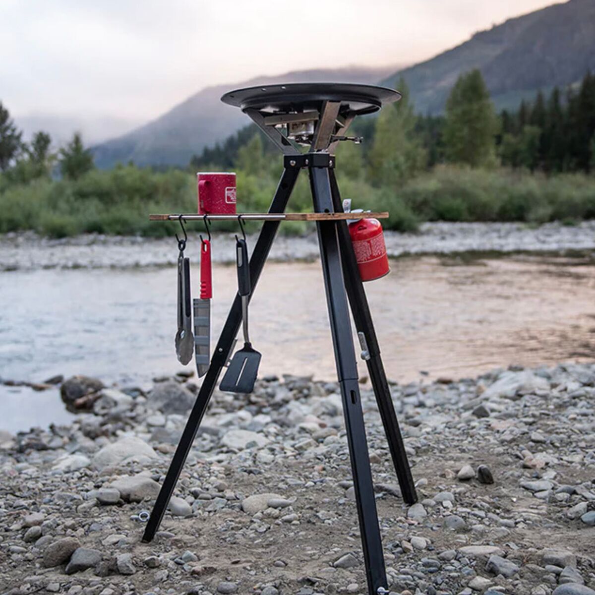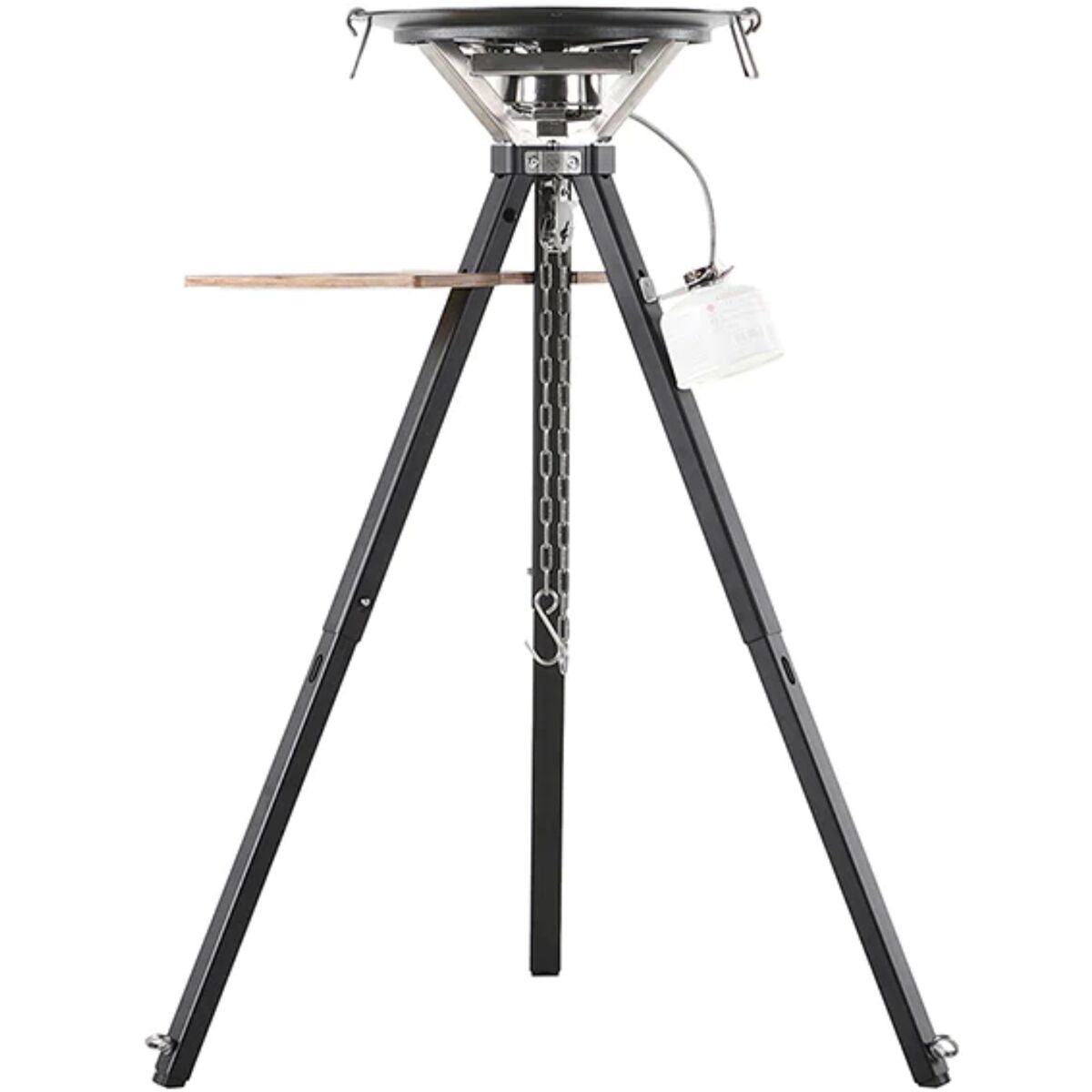 - [skillet] enamel-coated Meehanite cast iron, [tripod] anodized aluminum, [table] furniture-grade waterproof birch plywood