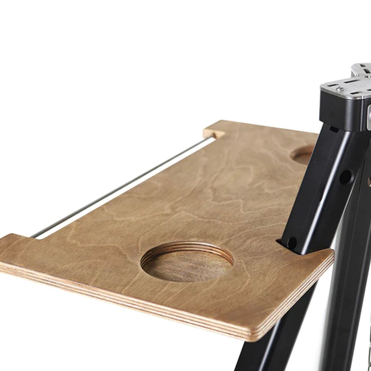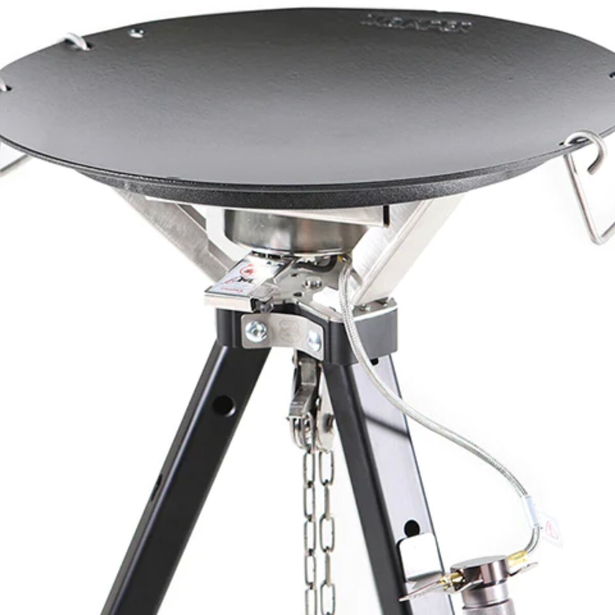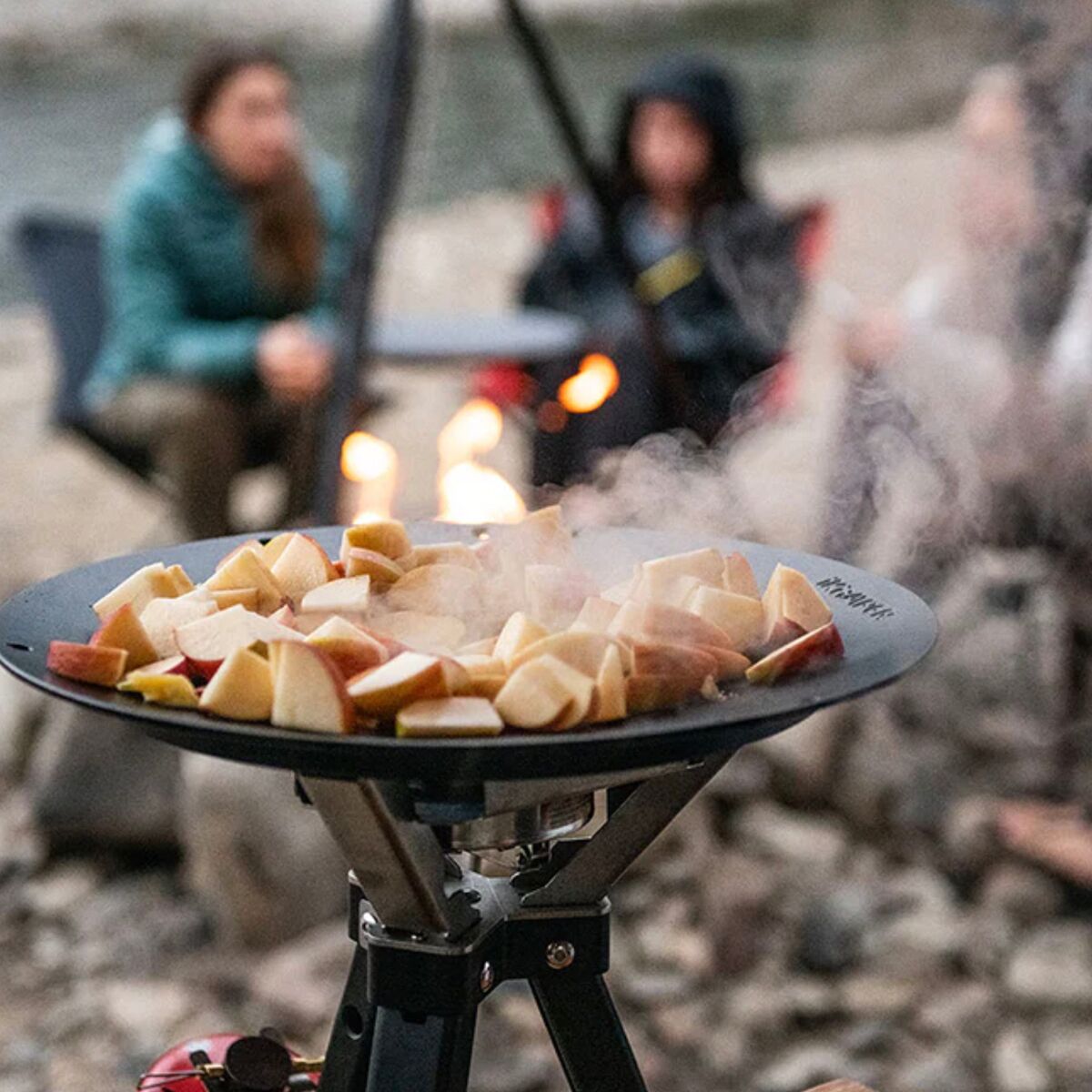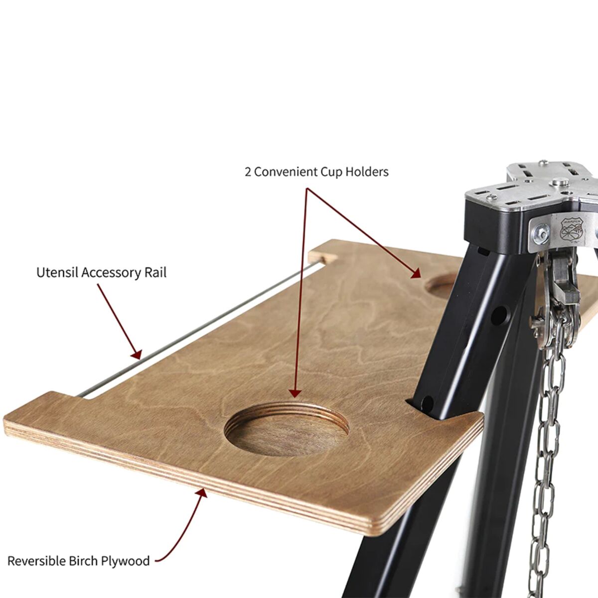 - [skillet] enamel-coated Meehanite cast iron, [tripod] anodized aluminum, [table] furniture-grade waterproof birch plywood