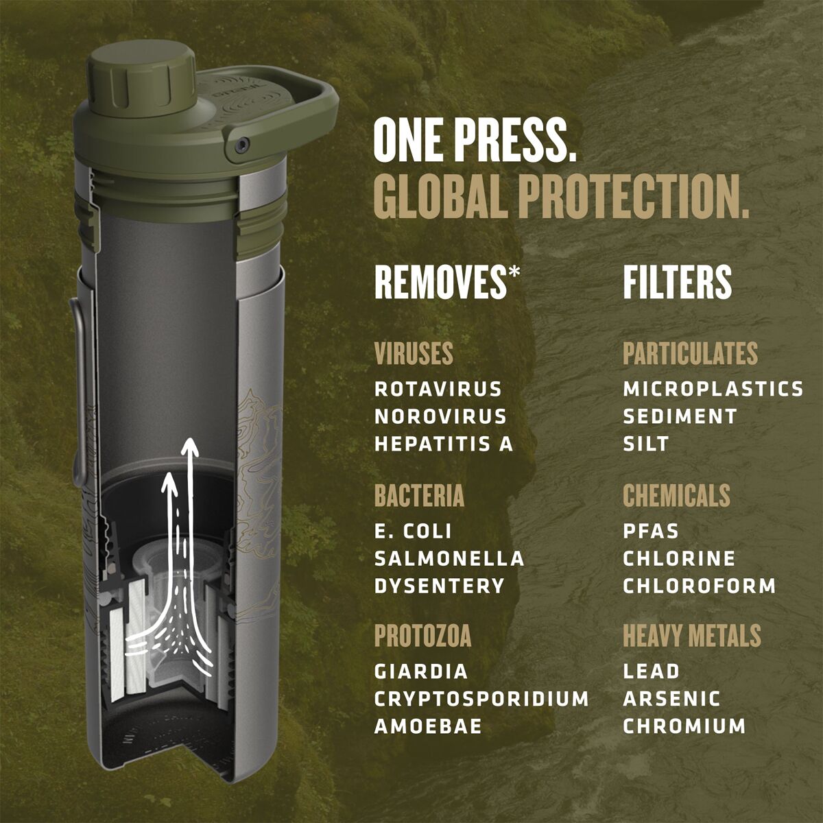 The GRAYL UltraPress Titanium Filter & Purifier Bottle provides unparalleled strength for the weight while both filtering and purifying water when we´re hiking, camping, or traveling internationally. The UltraPress filter gives us half a liter of clean water in only ten seconds while removing almost all waterborne pathogens—including viruses (e.g. Rotavirus, SARS, Hepatitis A, Norovirus), bacteria (e.g. E. coli, Cholera, Salmonella, Dysentery) and Protozoa (e.g. Giardia, Cryptosporidium, Amoebae), pesticides, herbicides, PFAS, microplastics, and heavy metals—making it appropriate for travel on all continents. The titanium construction also stands out for its outstanding durability, and the Outer Ti Cup also doubles as a cooking pot because we can place it directly on our camp stove or over a fire. The one-way silicone valve also allows us to add electrolytes or drink mixes to our water for more versatile hydration for our hikes and travels.
