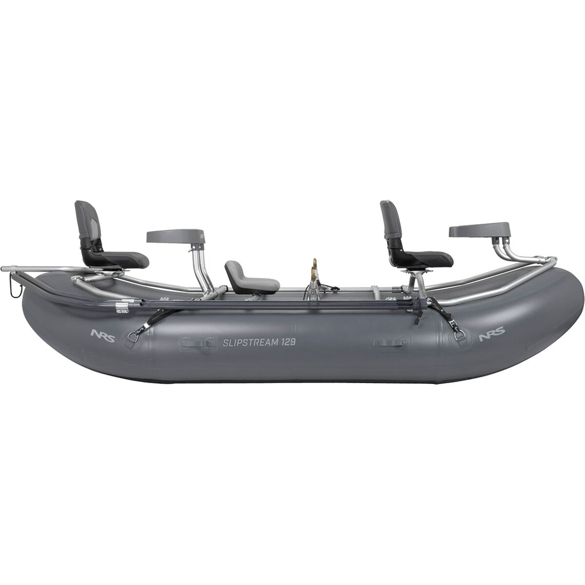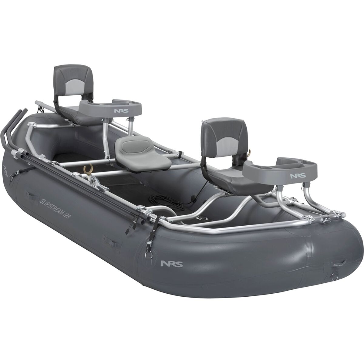 The raft package includes the Slipstream 12’9” Raft plus the NRS frame and fittings, padded rower´s seat, NRS 8-inch oar mounts, front and rear angler seats, front and rear thigh hooks, an internal anchor system with 3/8in anchor line, anchor lock, dual rod holders, 4 tie-down straps, and a Super 2 HP pump.