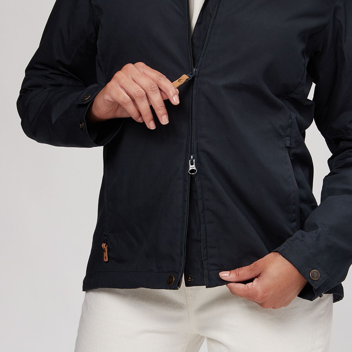 • Buttoned sleeve cuffs and zippered hand pockets add classic flair