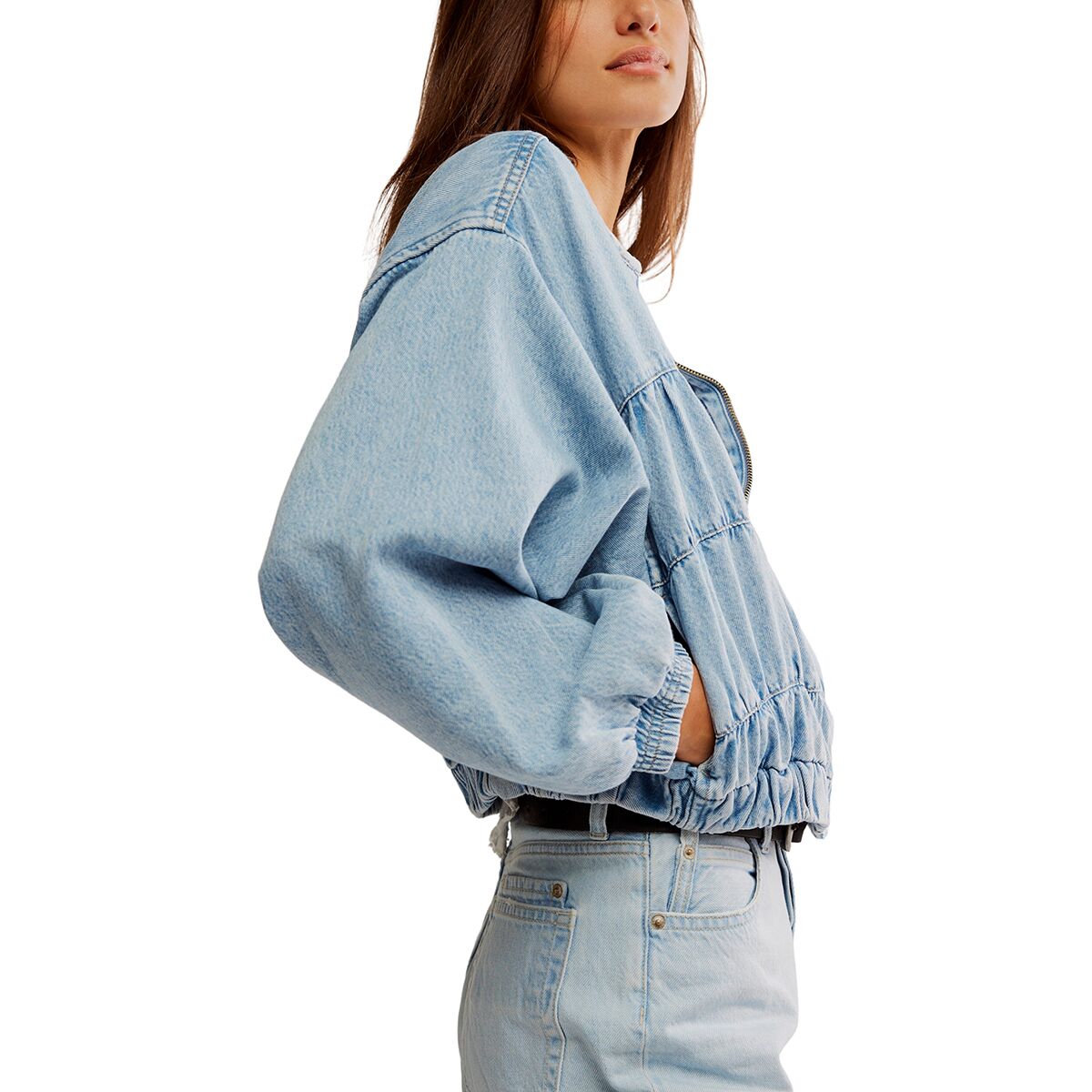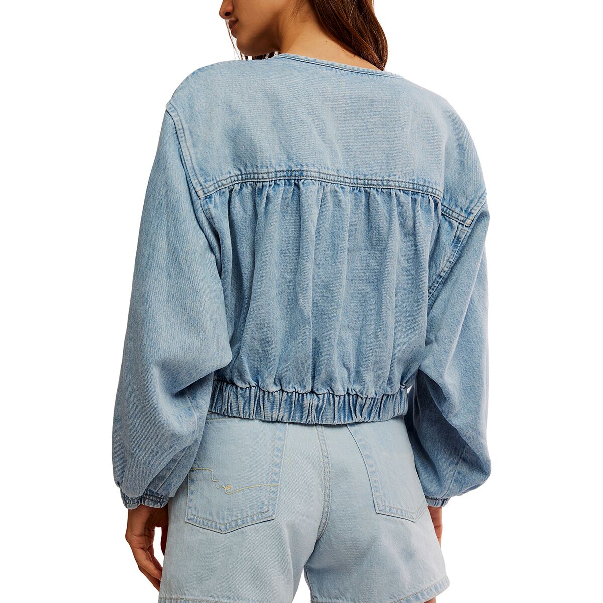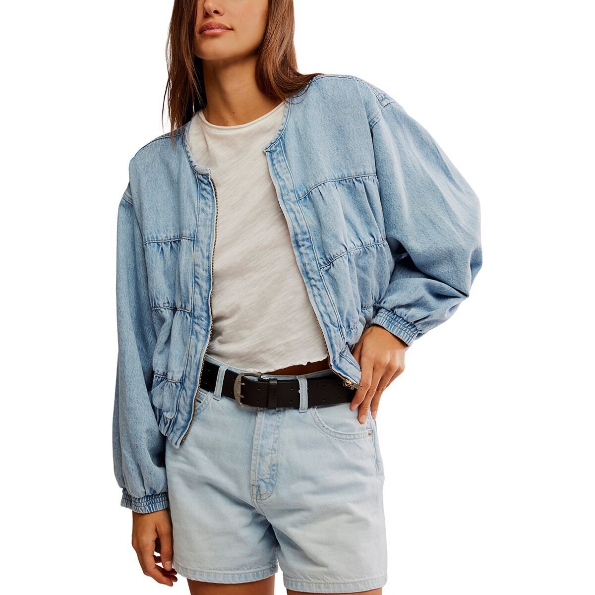 - Cropped denim jacket with ruched seams for a textured, vintage-inspired look