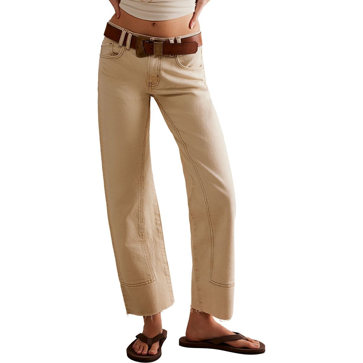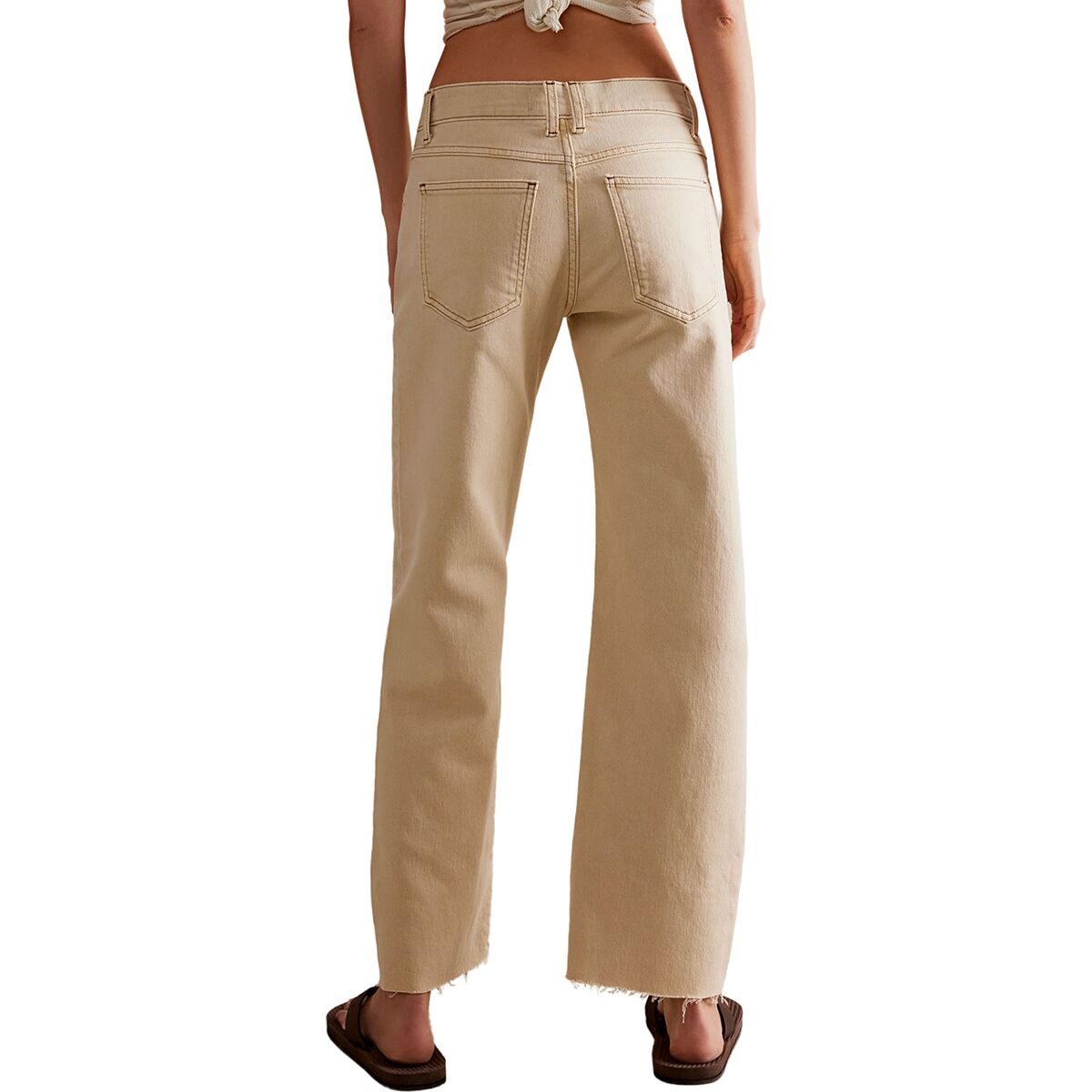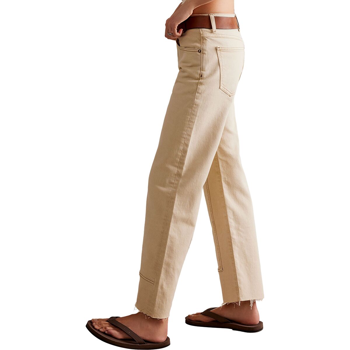 • Ankle-length cut with a frayed hem for a modern touch
