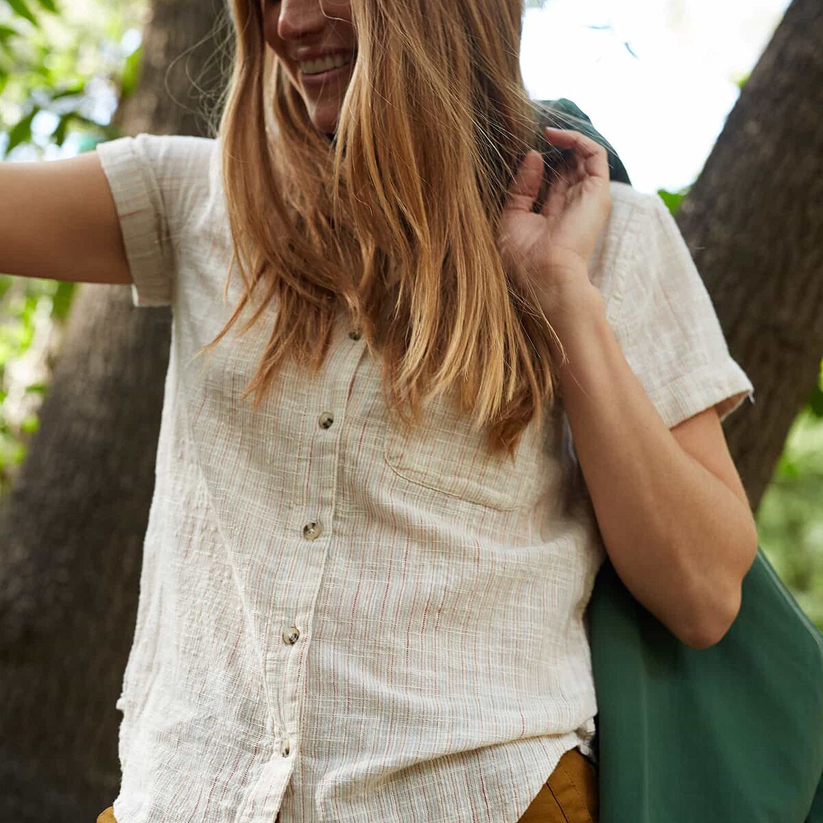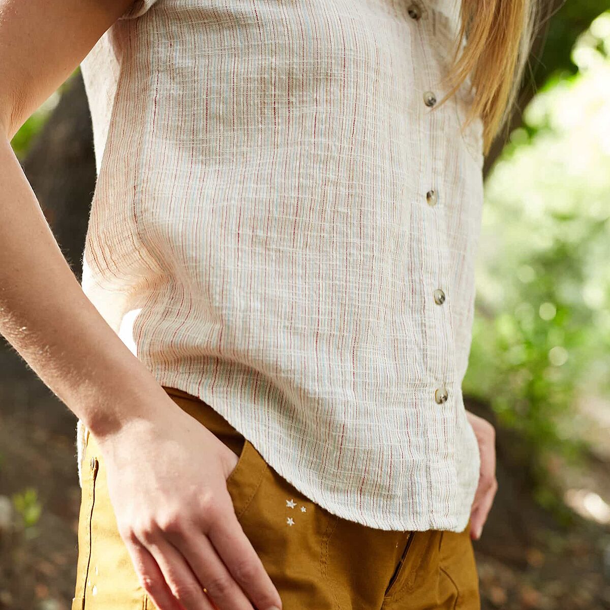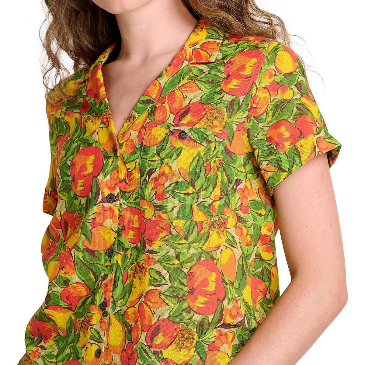• Flowy button-up top for camp and casual wear