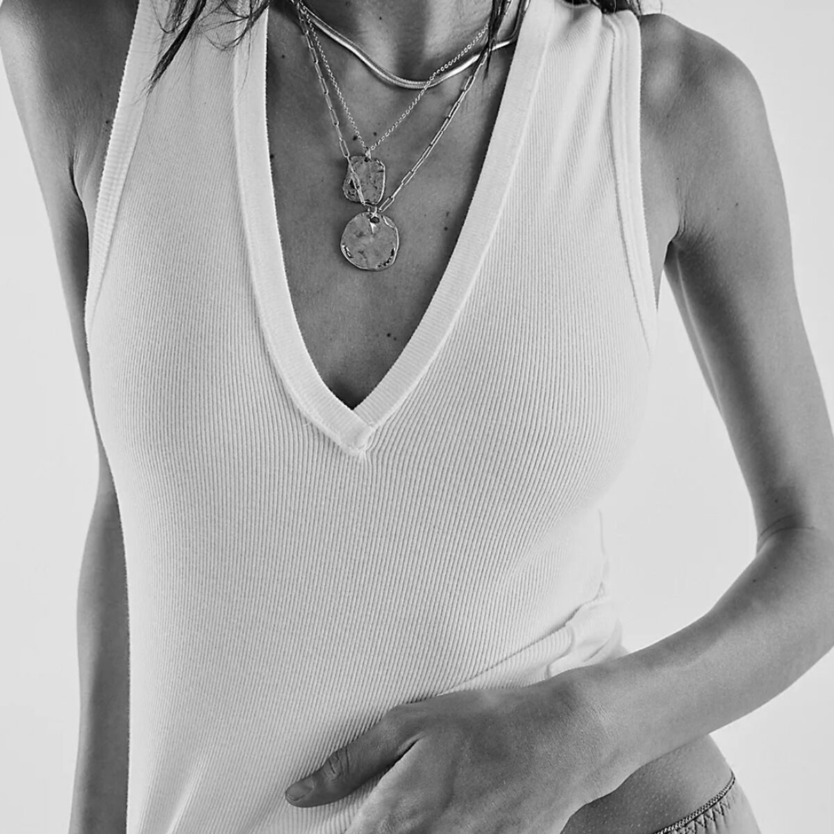 "This tank has become a staple in my wardrobe. The slim fit is flattering without feeling restrictive, and the dropped armholes add a little extra breathability. I love how the V-neckline works for layering or wearing solo. It’s one of those pieces that works for everything—casual days, workouts, or even dressed up with a denim jacket."