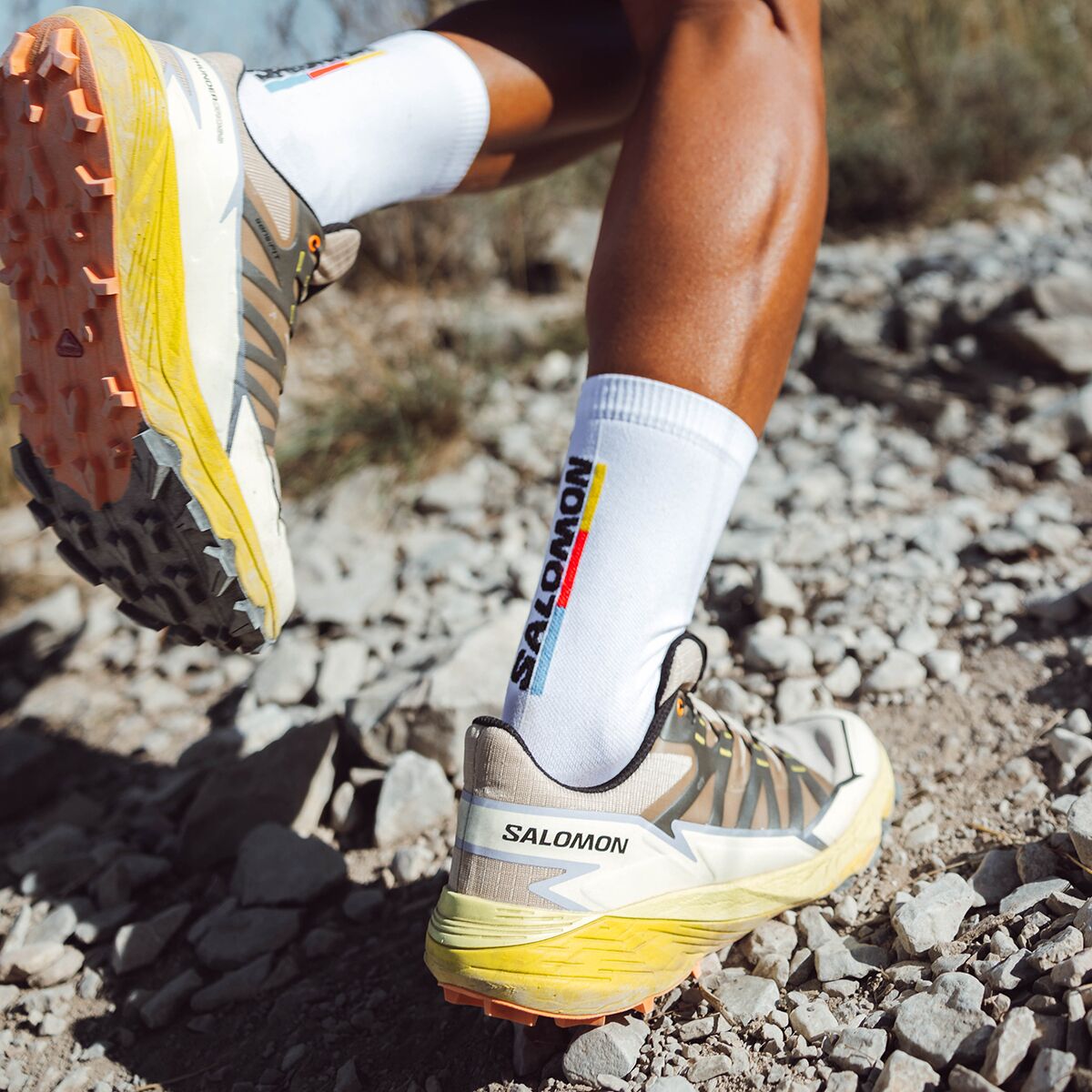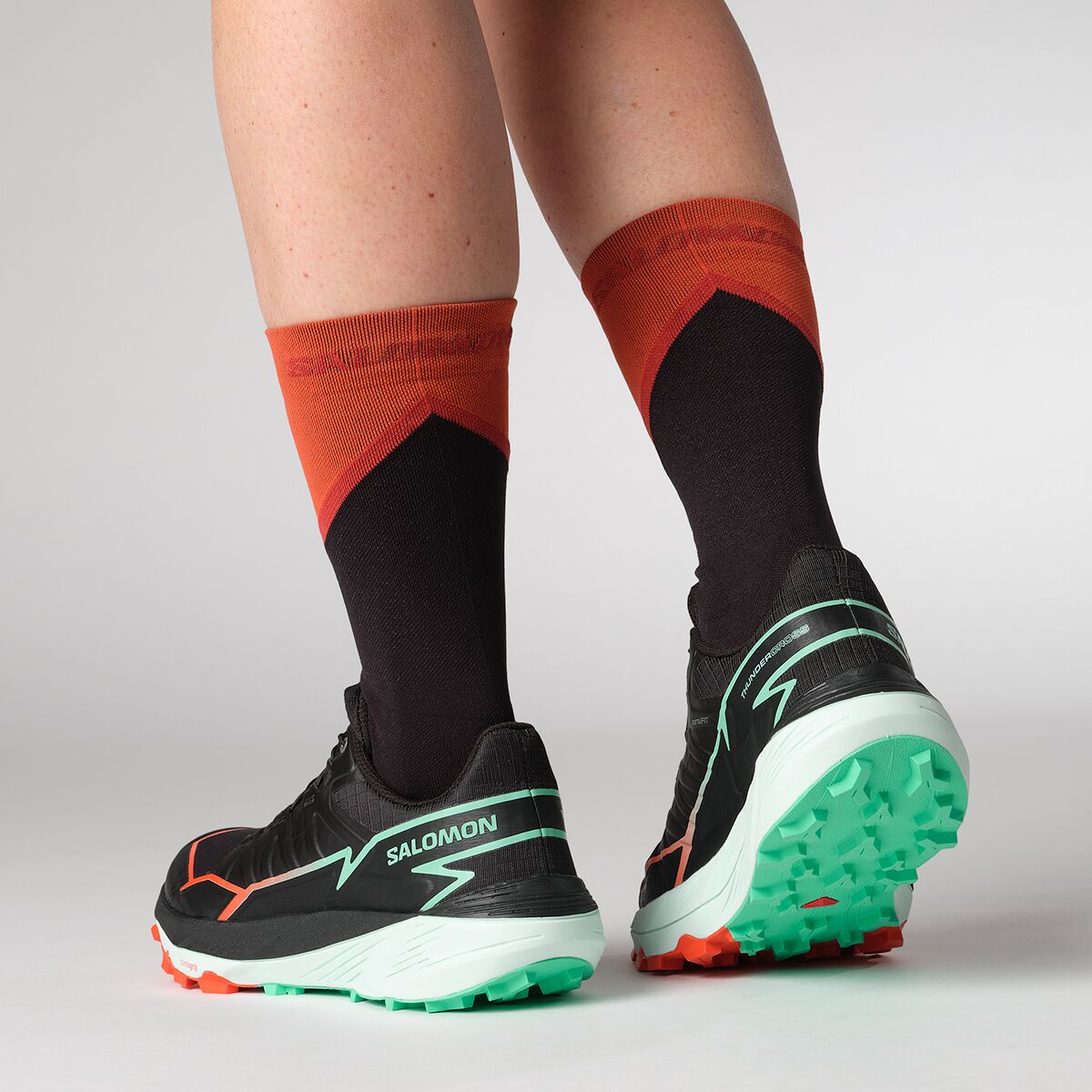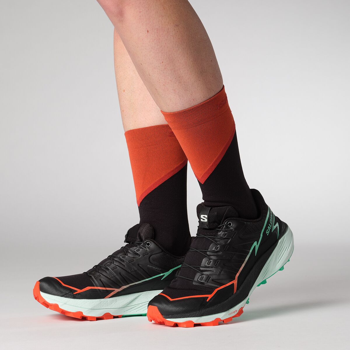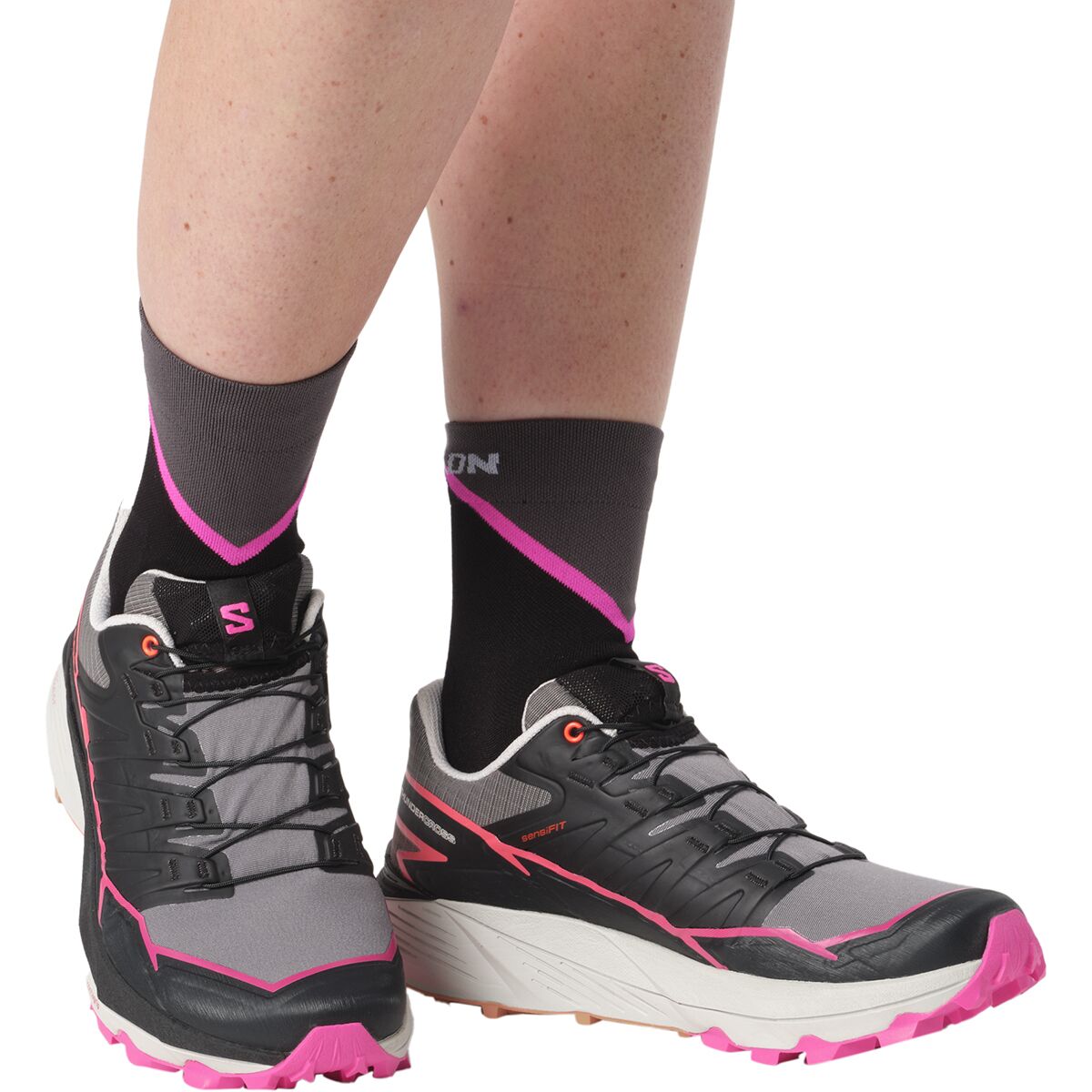 Striding into double-digit miles is cushier in the Salomon Thundercross Trail Running Shoe. When cinched in, the Sensifit tech locks our foot over the thick stack of energized foam that pads rocky trails without weighing us down and propels us onward for smooth transitions. No matter what terrain we encounter—hardpacked, loose, wet—the aggressive, multi-directional lugs secure our footing, ensuring no energy is leaked.