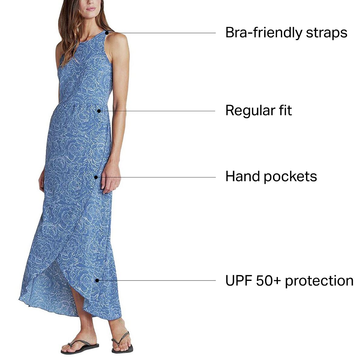 Comfort meets easy-going, yet dependable style in the Toad&Co Women´s Sunkissed Maxi Dress. The Sunkissed offers an effortless look thanks to its tulip-inspired front detailing, while the stretch woven fabric lends a technical hand to ensure that the fabric wicks away moisture and dries quickly. Additionally, the Sunkissed is equipped with 50+ UPF protection that makes it an ideal companion for those beach-bound adventures. Bra-friendly straps ensure adaptive wearability, and the peak-a-boo cutout in the back provides a subtly flirty feel.